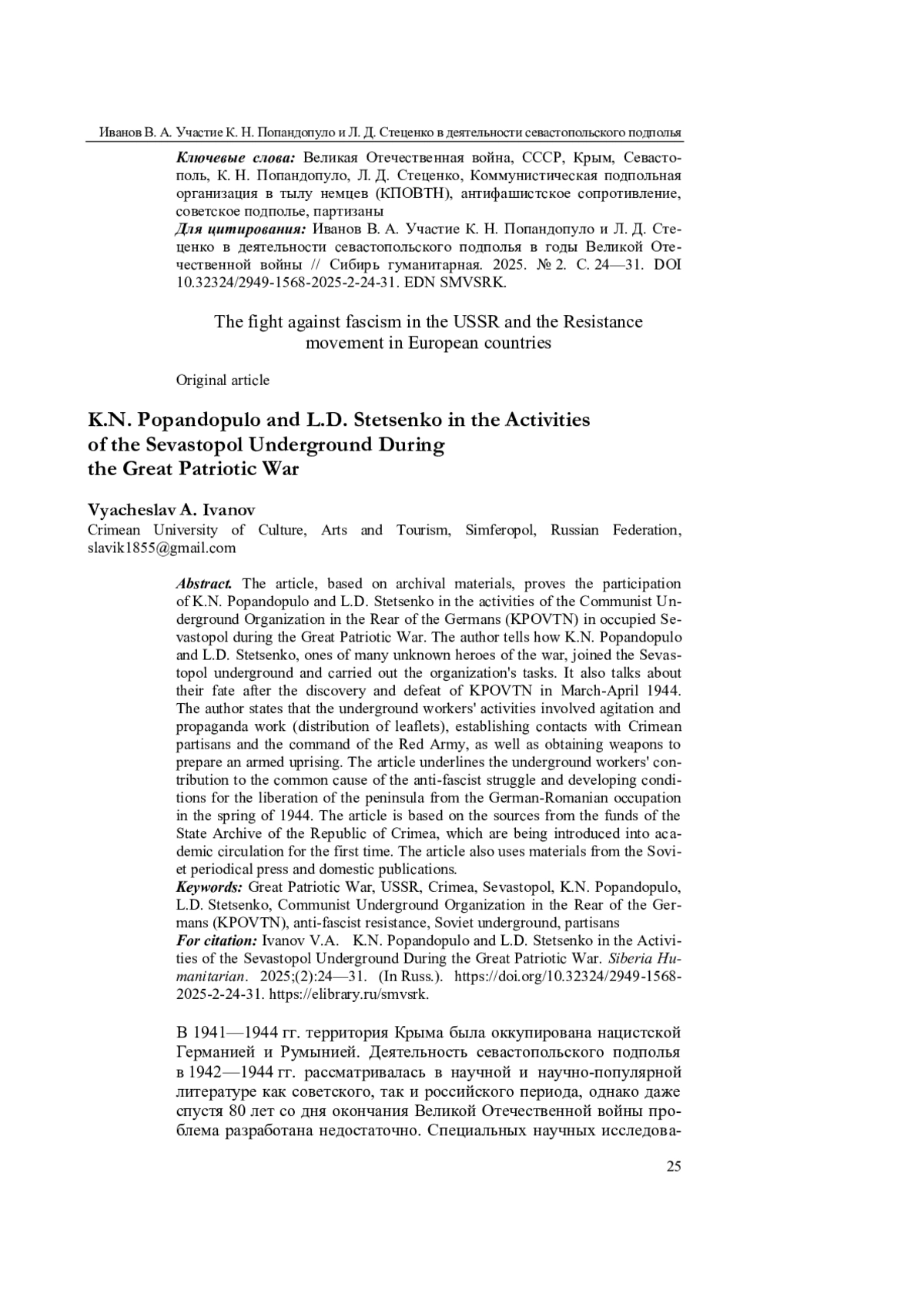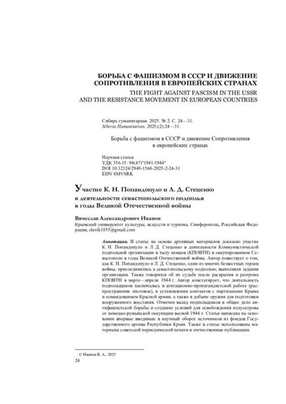 В статье на основе архивных материалов доказано участие К. Н. Попандопуло и Л. Д. Стеценко в деятельности Коммунистической подпольной организации в тылу немцев (КПОВТН) в оккупированном Севастополе в годы Великой Отечественной войны. Автор повествует о том, как К. Н. Попандопуло и Л. Д. Стеценко, одни из многих безвестных героев войны, присоединились к севастопольскому подполью, выполняли задания организации. Также говорится об их судьбе после раскрытия и разгрома КПОВТН в марте—апреле 1944 г. Автор констатирует, что деятельность подпольщиков заключалась в агитационно-пропагандистской работе (распространение листовок), в установлении контактов с партизанами Крыма и командованием Красной армии, а также в добыче оружия для подготовки вооруженного восстания. Отмечен вклад подпольщиков в общее дело антифашистской борьбы и создание условий для освобождения полуострова от немецко-румынской оккупации весной 1944 г. Статья написана на основании впервые вводимых в научный оборот источников из фондов Государственного архива Республики Крым. Также в статье использованы материалы советской периодической печати и отечественные публикации.