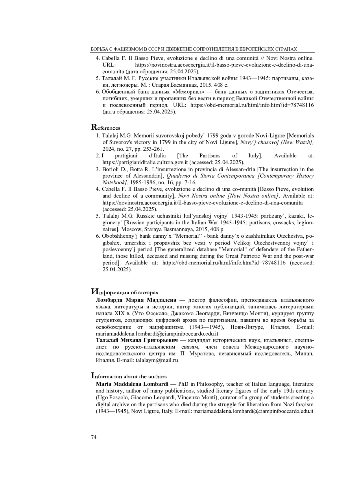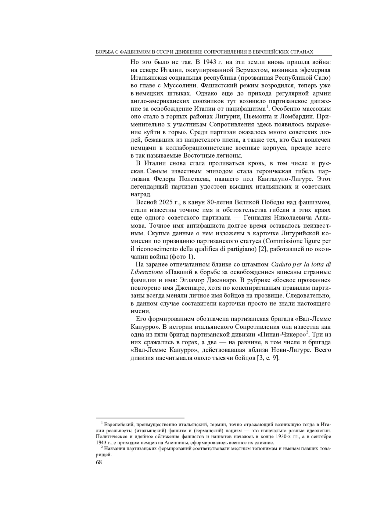 ЛОМБАРДИ М. М., ТАЛАЛАЙ М. Г. ПАЛ В БОРЬБЕ ЗА ОСВОБОЖДЕНИЕ ИТАЛИИ: СОВЕТСКИЙ ПАРТИЗАН ГЕННАДИЙ АГЛАМОВ // СИБИРЬ ГУМАНИТАРНАЯ. 2025. № 2 (10)