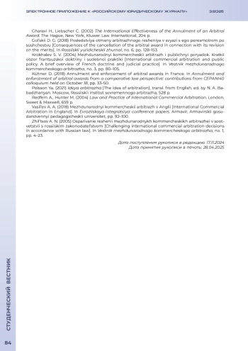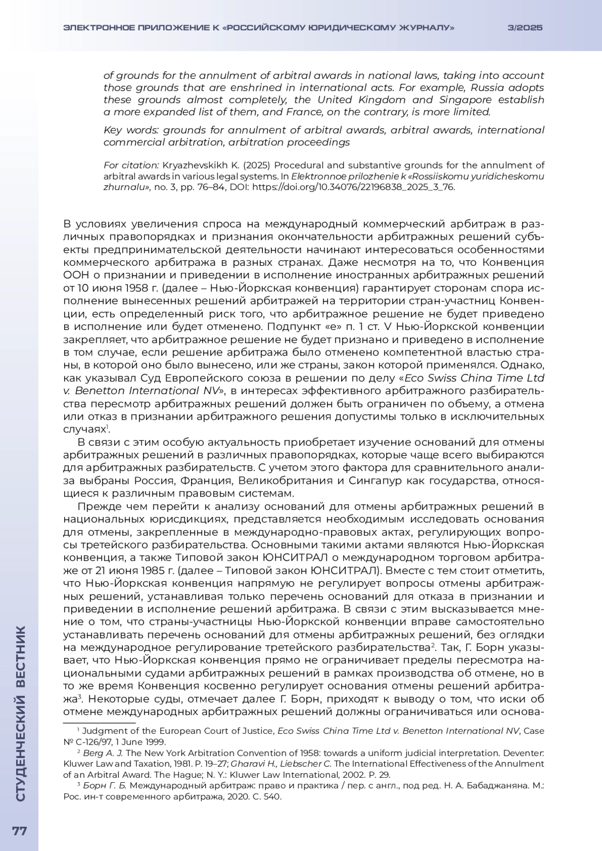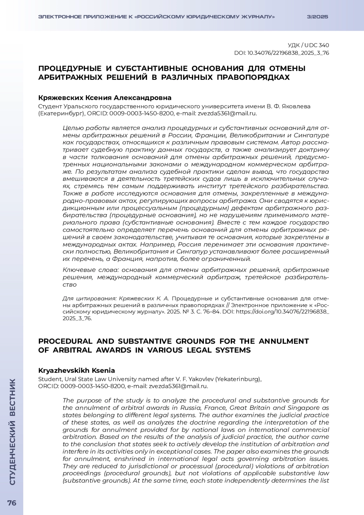 КРЯЖЕВСКИХ К. А. ПРОЦЕДУРНЫЕ И СУБСТАНТИВНЫЕ ОСНОВАНИЯ ДЛЯ ОТМЕНЫ АРБИТРАЖНЫХ РЕШЕНИЙ В РАЗЛИЧНЫХ ПРАВОПОРЯДКАХ // ЭЛЕКТРОННОЕ ПРИЛОЖЕНИЕ К РОССИЙСКОМУ ЮРИДИЧЕСКОМУ ЖУРНАЛУ. 2025. № 3