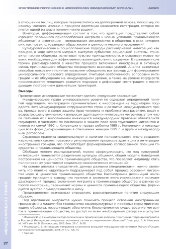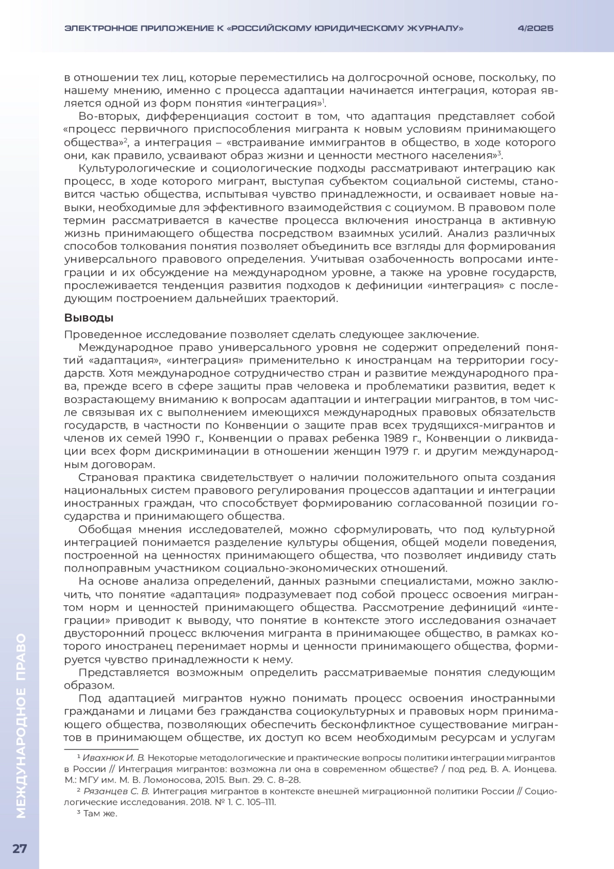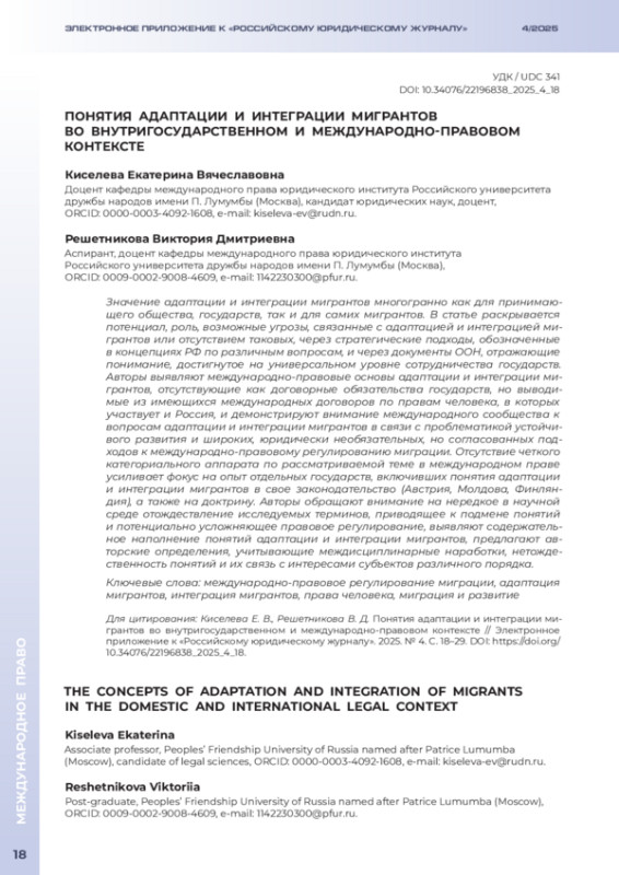 Значение адаптации и интеграции мигрантов многогранно как для принимающего общества, государств, так и для самих мигрантов. В статье раскрывается потенциал, роль, возможные угрозы, связанные с адаптацией и интеграцией мигрантов или отсутствием таковых, через стратегические подходы, обозначенные в концепциях РФ по различным вопросам, и через документы ООН, отражающие понимание, достигнутое на универсальном уровне сотрудничества государств. Авторы выявляют международно-правовые основы адаптации и интеграции мигрантов, отсутствующие как договорные обязательства государств, но выводимые из имеющихся международных договоров по правам человека, в которых участвует и Россия, и демонстрируют внимание международного сообщества к вопросам адаптации и интеграции мигрантов в связи с проблематикой устойчивого развития и широких, юридически необязательных, но согласованных подходов к международно-правовому регулированию миграции. Отсутствие четкого категориального аппарата по рассматриваемой теме в международном праве усиливает фокус на опыт отдельных государств, включивших понятия адаптации и интеграции мигрантов в свое законодательство (Австрия, Молдова, Финляндия), а также на доктрину. Авторы обращают внимание на нередкое в научной среде отождествление исследуемых терминов, приводящее к подмене понятий и потенциально усложняющее правовое регулирование, выявляют содержательное наполнение понятий адаптации и интеграции мигрантов, предлагают авторские определения, учитывающие междисциплинарные наработки, нетождественность понятий и их связь с интересами субъектов различного порядка.