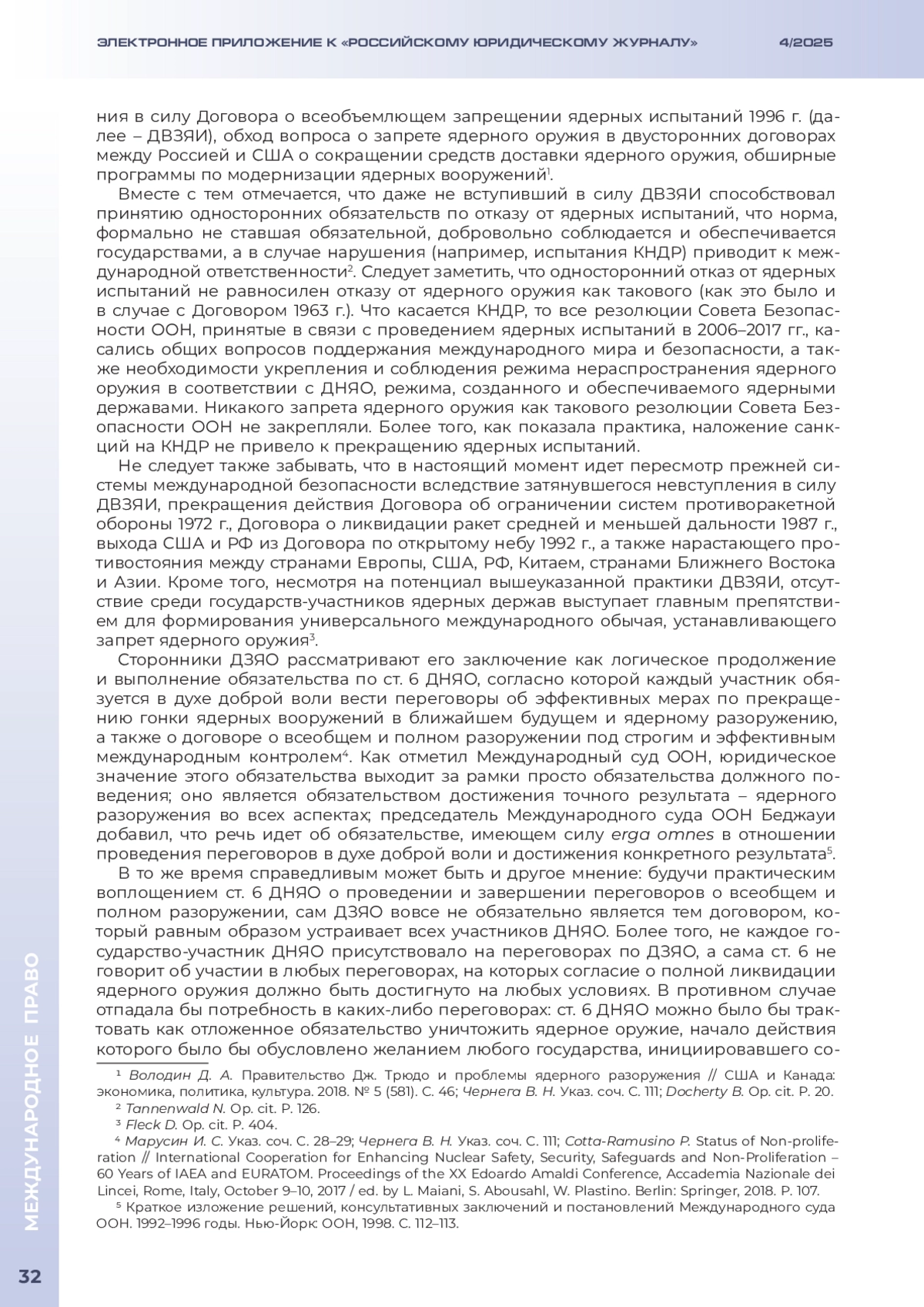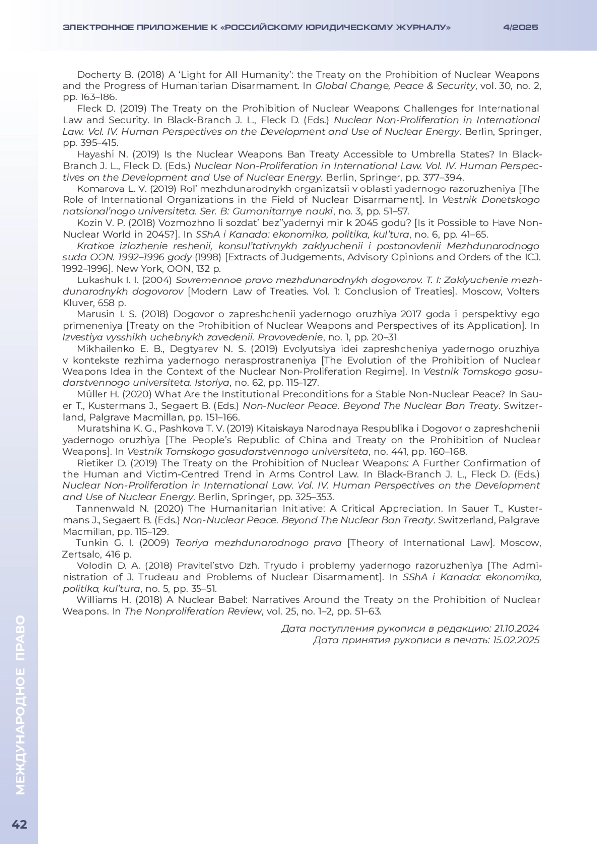 8. Марусин И. С. Договор о запрещении ядерного оружия 2017 года и перспективы его применения // Известия высших учебных заведений. Правоведение. 2018. № 1. С. 20-31. EDN: UYYMIQ