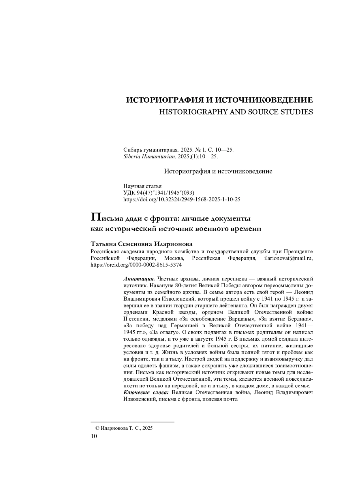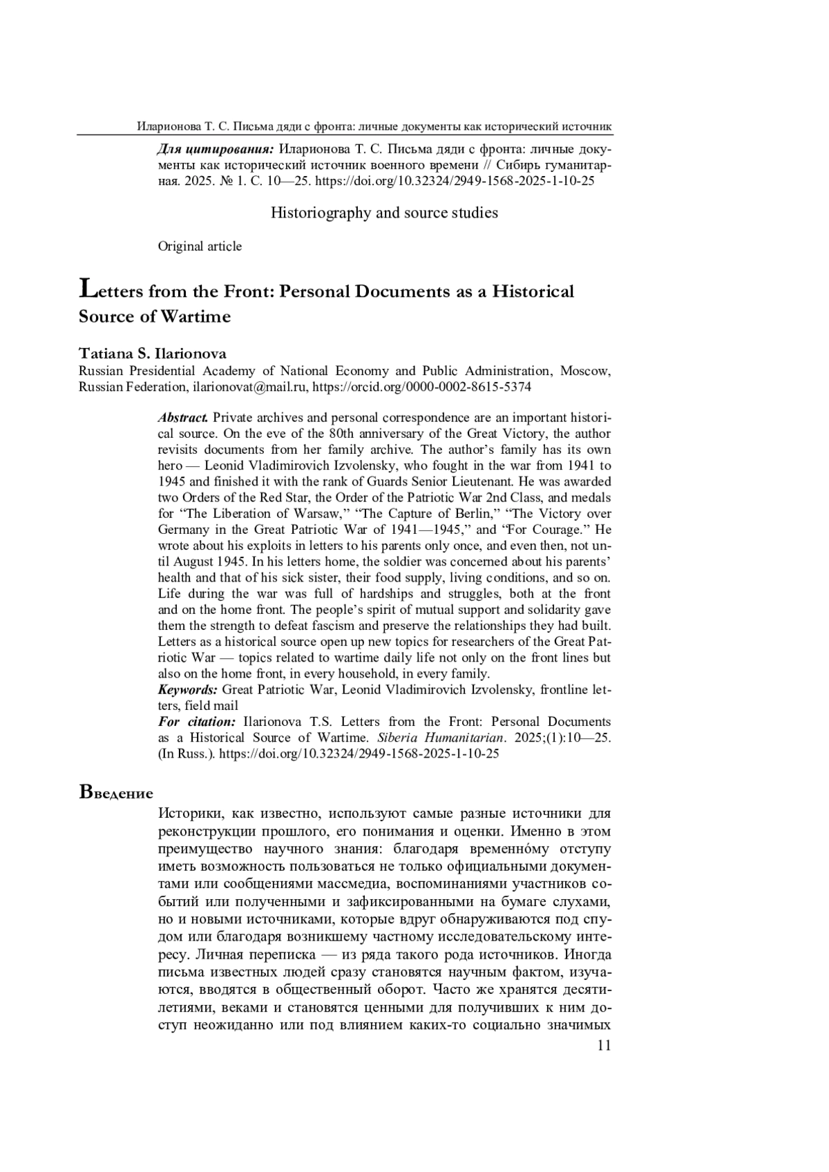 Частные архивы, личная переписка — важный исторический источник. Накануне 80-летия Великой Победы автором переосмыслены документы из семейного архива. В семье автора есть свой герой — Леонид Владимирович Изволенский, который прошел войну с 1941 по 1945 г. и за-вершил ее в звании гвардии старшего лейтенанта. Он был награжден двумя орденами Красной звезды, орденом Великой Отечественной войны II степени, медалями «За освобождение Варшавы», «За взятие Берлина», «За победу над Германией в Великой Отечественной войне 1941—1945 гг.», «За отвагу». О своих подвигах в письмах родителям он написал только однажды, и то уже в августе 1945 г. В письмах домой солдата интересовало здоровье родителей и больной сестры, их питание, жилищные условия и т. д. Жизнь в условиях войны была полной тягот и проблем как на фронте, так и в тылу. Настрой людей на поддержку и взаимовыручку дал силы одолеть фашизм, а также сохранить уже сложившиеся взаимоотношения. Письма как исторический источник открывают новые темы для исследователей Великой Отечественной, эти темы, касаются военной повседневности не только на передовой, но и в тылу, в каждом доме, в каждой семье.