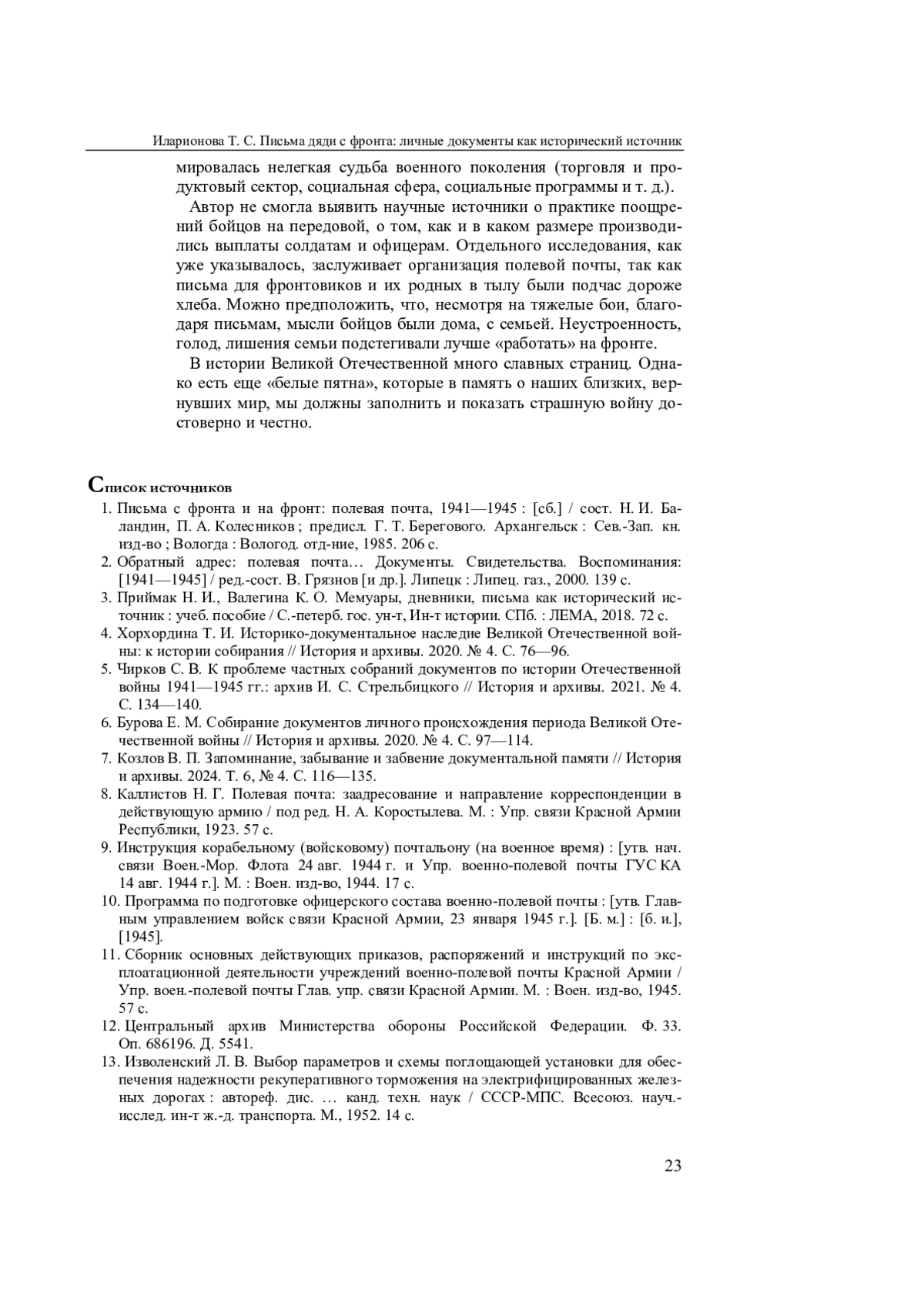 4. Хорхордина Т. И. Историко-документальное наследие Великой Отечественной войны: к истории собирания // История и архивы. 2020. № 4. С. 76-96.