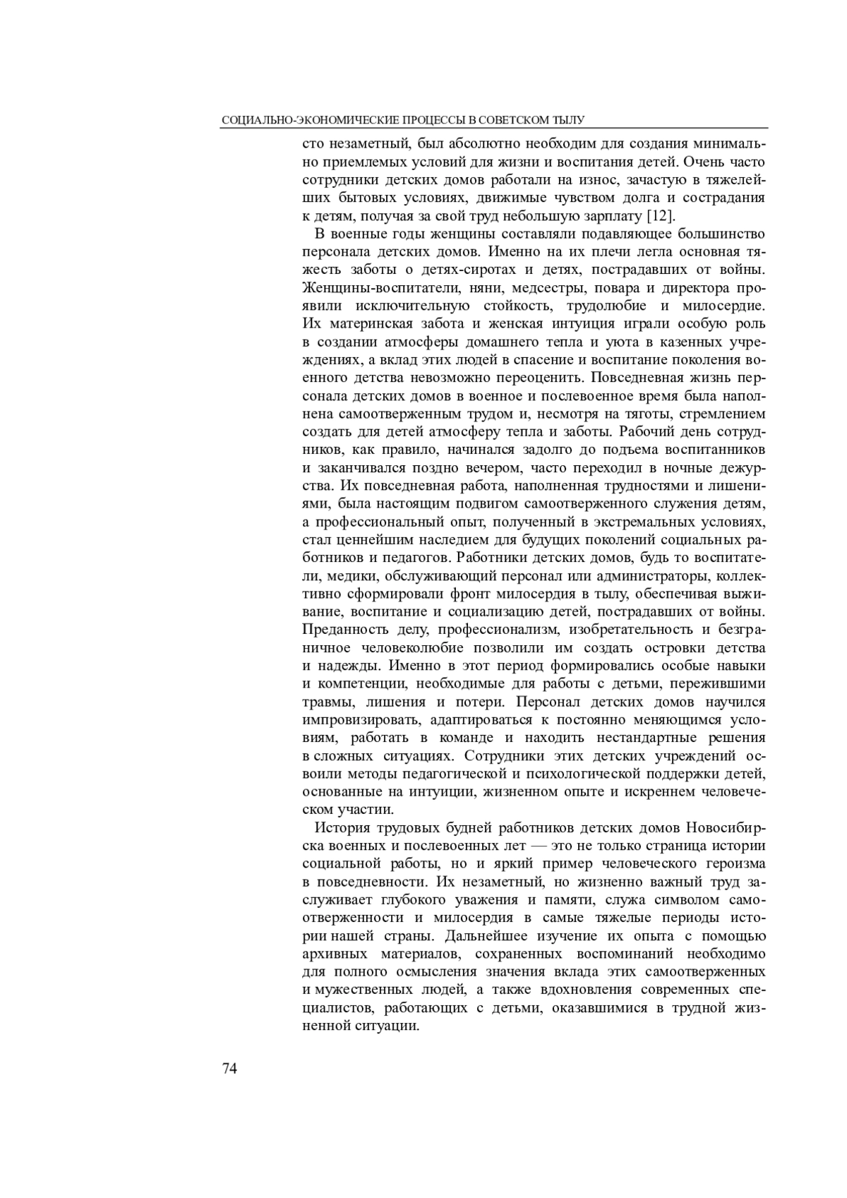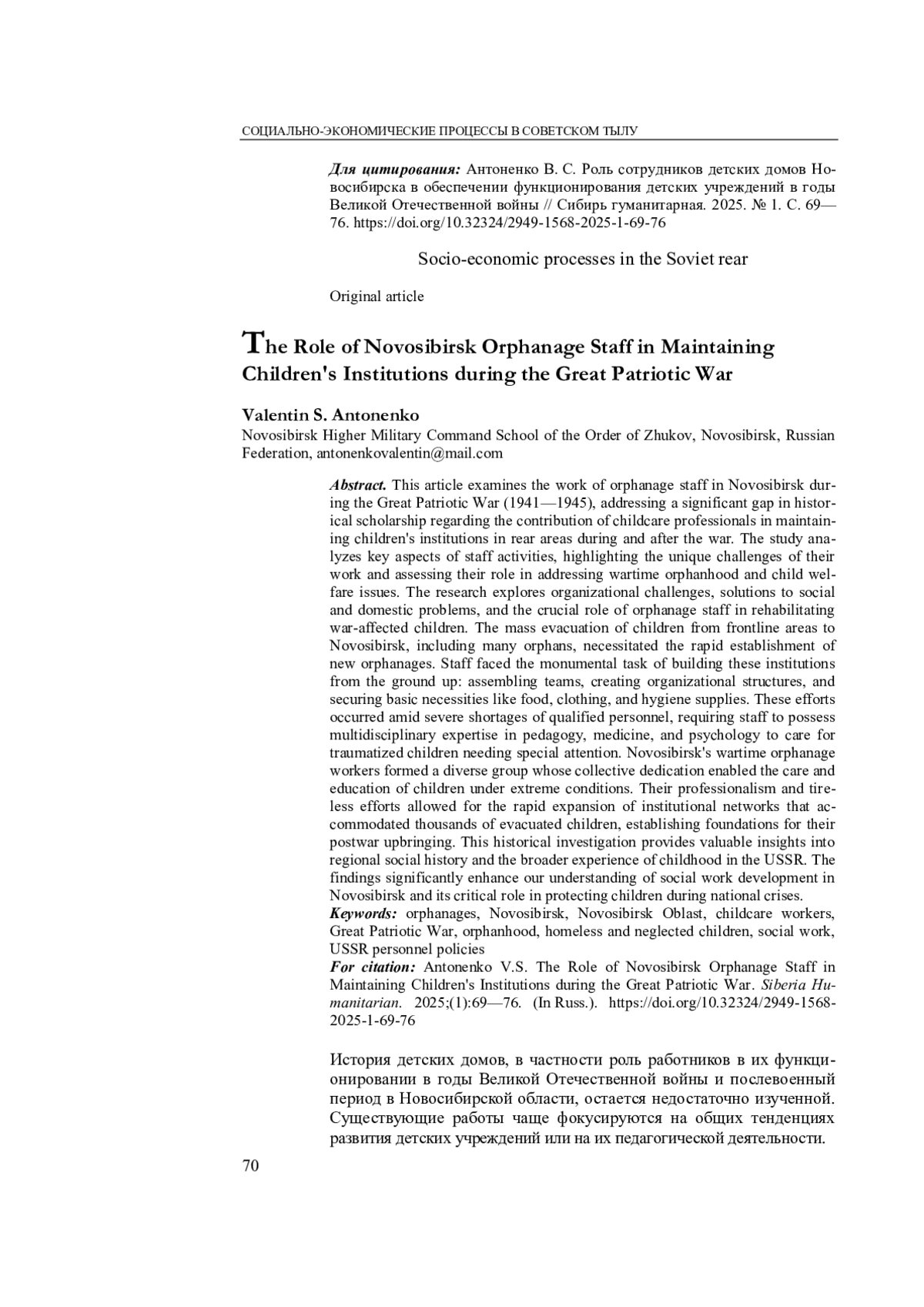 Статья посвящена деятельности работников детских домов Новосибирска в период Великой Отечественной войны. Автор восполняет пробел в историческом знании о вкладе персонала детских домов в обеспечение функционирования детских учреждений в тыловом регионе страны в военные и послевоенные годы. В статье анализируются основные направления деятельности персонала, показана специфика их работы, а также дана оценка их вклада в решение социальных проблем сиротства и детства. Рассматриваются вопросы организации труда, решения социальных и бытовых проблем, а также роли сотрудников детских домов в адаптации и реабилитации детей, пострадавших от войны. Эвакуация из прифронтовых регионов в Новосибирск большого количества детей, в том числе осиротевших, потребовала создания новых детских домов. Встала задача организовать их деятельность с нуля: сформировать коллектив, создать организационную структуру, наладить обеспечение продовольствием, одеждой, предметами гигиены и т. д. Формирование трудовых коллективов проходило в условиях недостатка квалифицированных кадров. В детских домах от персонала требовались знания и навыки в области педагогики, медицины, психологии, умение работать с детьми, нуждающимися в особом подходе. Персонал детских домов Новосибирска военного времени представлял собой разнородную группу людей, каждый из которых вносил свой вклад в общее дело спасения и воспитания детей в тяжелейших условиях. Самоотверженность, профессионализм и неиссякаемая энергия персонала детских домов позволили в кратчайшие сроки развернуть сеть учреждений, принять и разместить десятки тысяч эвакуированных детей, заложив основу для их дальнейшей жизни и воспитания в тылу. Изучение этой страницы истории представляется важным для понимания социальной истории региона и истории детства в СССР в целом. Полученные результаты позволяют расширить представление об истории социальной работы в Новосибирске и оценить ее значение в обеспечении благополучия детей в кризисные периоды истории.
