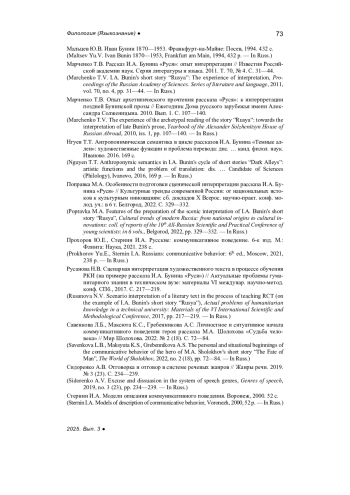 Rusanova N.V. Scenario interpretation of a literary text in the process of teaching RCT (on the example of I.A. Bunin’s short story “Rusya”), Actual problems of humanitarian knowledge in a technical university: Materials of the VI International Scientific and Methodological Conference, 2017, pp. 217-219. - In Russ.