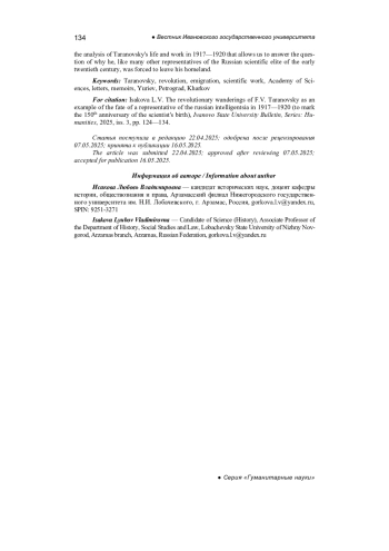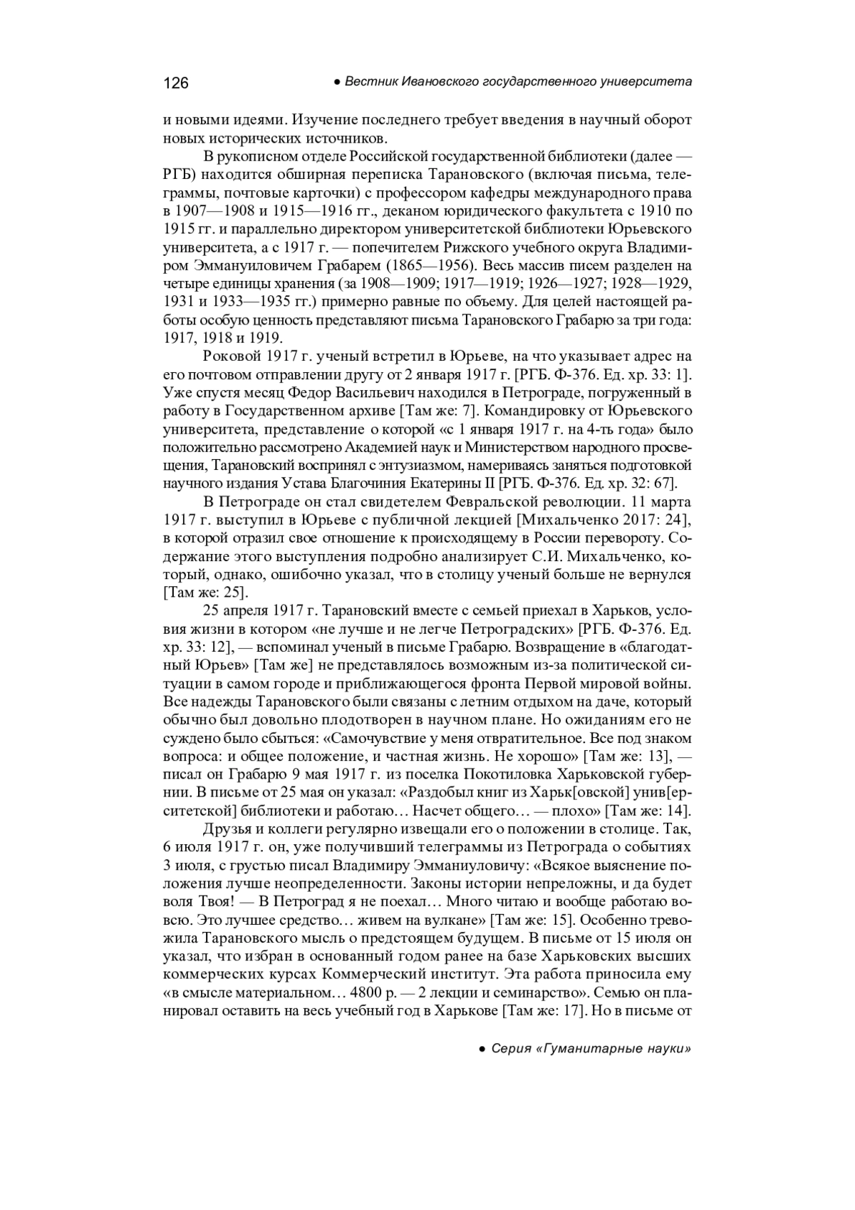 Статья посвящена изучению личной жизни, преподавательской, общественной и политической работе историка права, профессора Федора Васильевича Тарановского в период с 1917 г. по 1920 г. Хронологические рамки исследования обусловлены необходимостью рассмотрения его биографии в сложный исторический период революции и Гражданской войны в России. На основе привлечения архивных материалов, а именно писем Тарановского другу, попечителю Рижского учебного округа В. Э. Грабарю, воспоминаний его коллеги по Киевской Акаде мии наук, механика С. П. Тимошенко был реконструирован важный этап жизни ученого. Выводы по итогам проведенного исследования позволяют говорить о том, что судьба Федора Васильевича, наполненная жизненными неурядицами и экономическими проблемами, является классическим примером судьбы представителя русской интеллигенции указанного времени. Именно анализ жизни и деятельности Тарановского в 1917— 1920 гг. позволяет ответить на вопрос, почему же он, как и многие другие представители русской научной элиты начала ХХ в., был вынужден покинуть пределы Родины