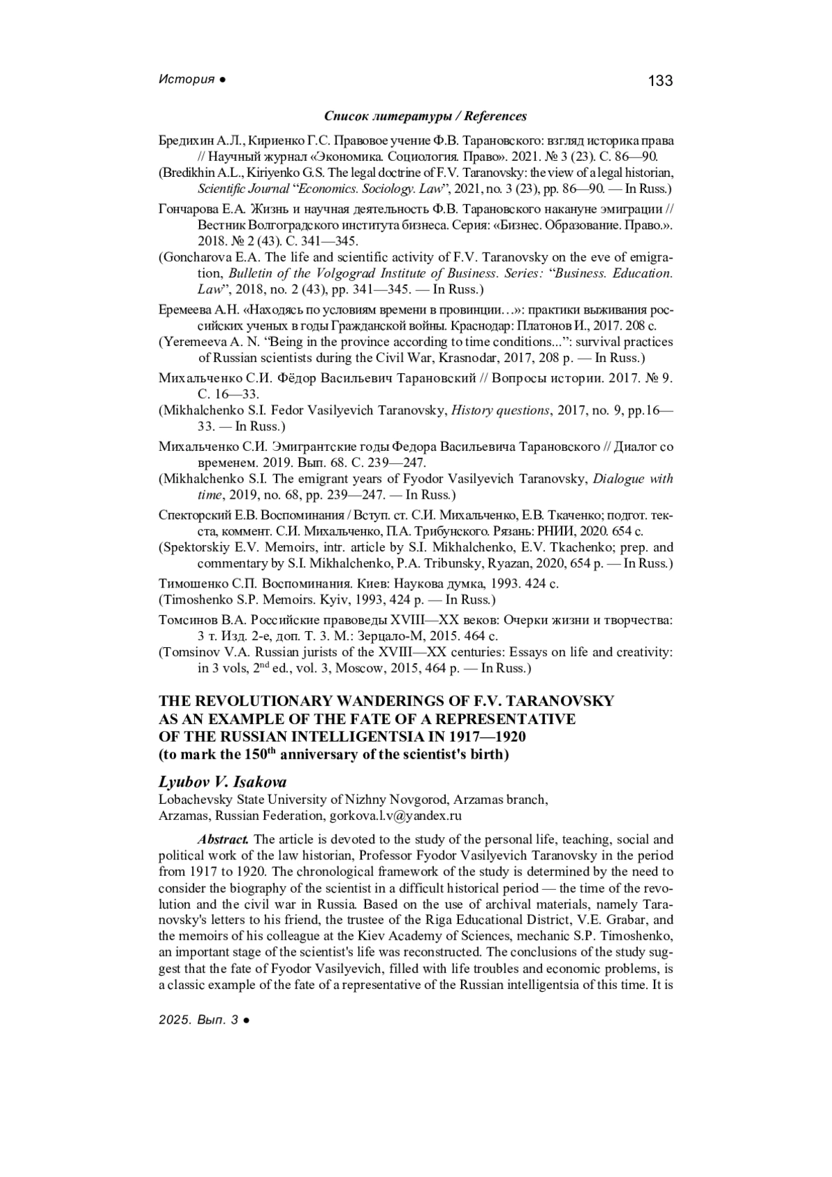 3. Бредихин А.Л., Кириенко Г.С. Правовое учение Ф.В. Тарановского: взгляд историка права // Научный журнал “Экономика. Социология. Право”. 2021. № 3 (23). С. 86-90.