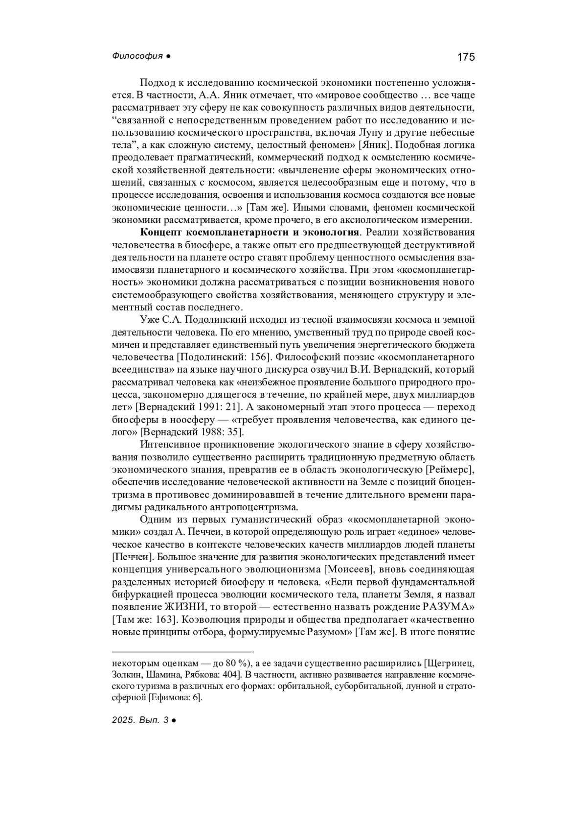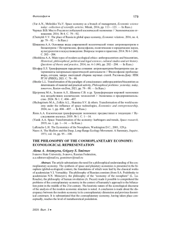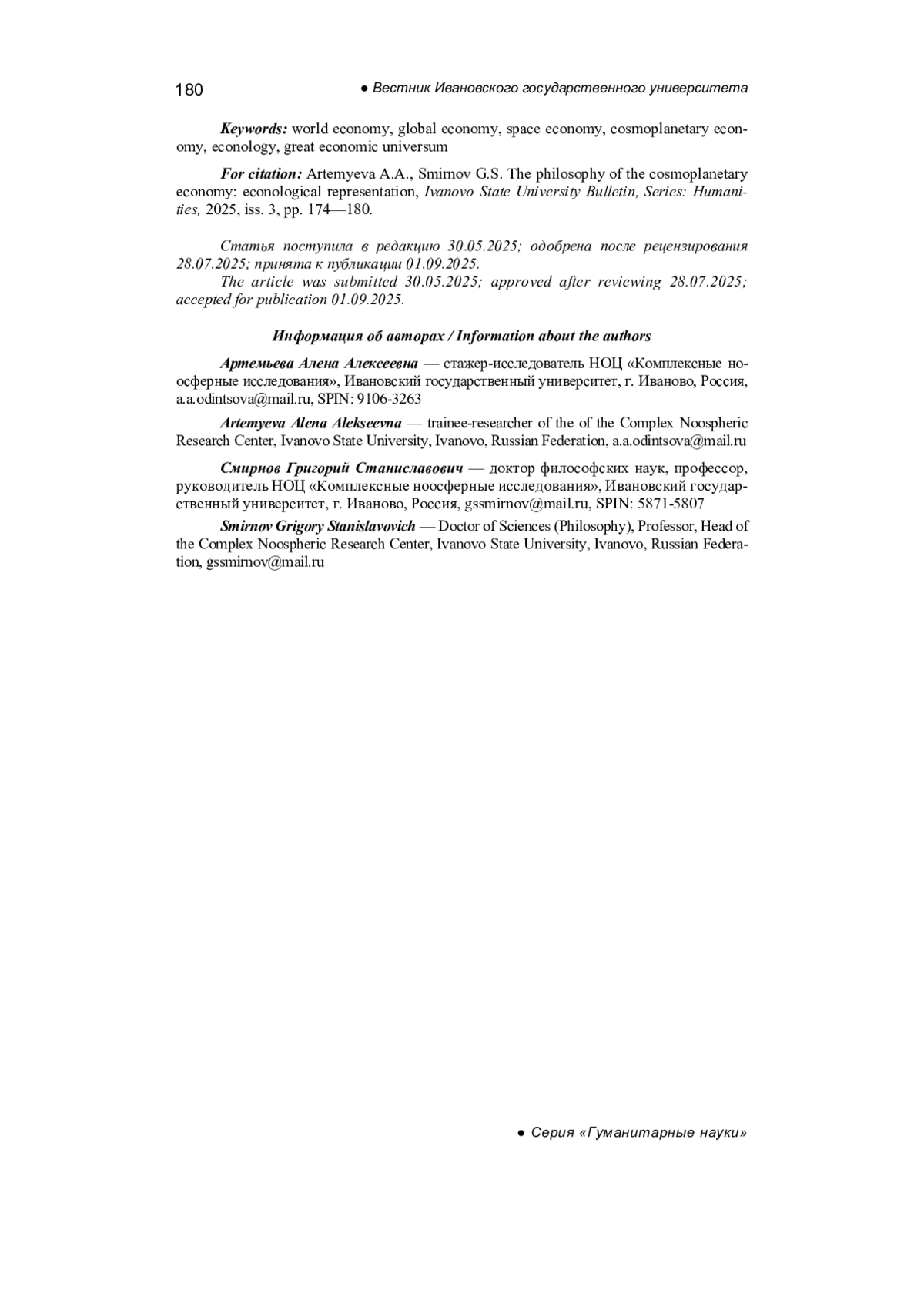 АРТЕМЬЕВА А. А., СМИРНОВ Г. С. ФИЛОСОФИЯ КОСМОПЛАНЕТАРНОЙ ЭКОНОМИКИ: ЭКОНОЛОГИЧЕСКАЯ РЕПРЕЗЕНТАЦИЯ // ВЕСТНИК ИВАНОВСКОГО ГОСУДАРСТВЕННОГО УНИВЕРСИТЕТА. СЕРИЯ: ГУМАНИТАРНЫЕ НАУКИ. 2025. № 3