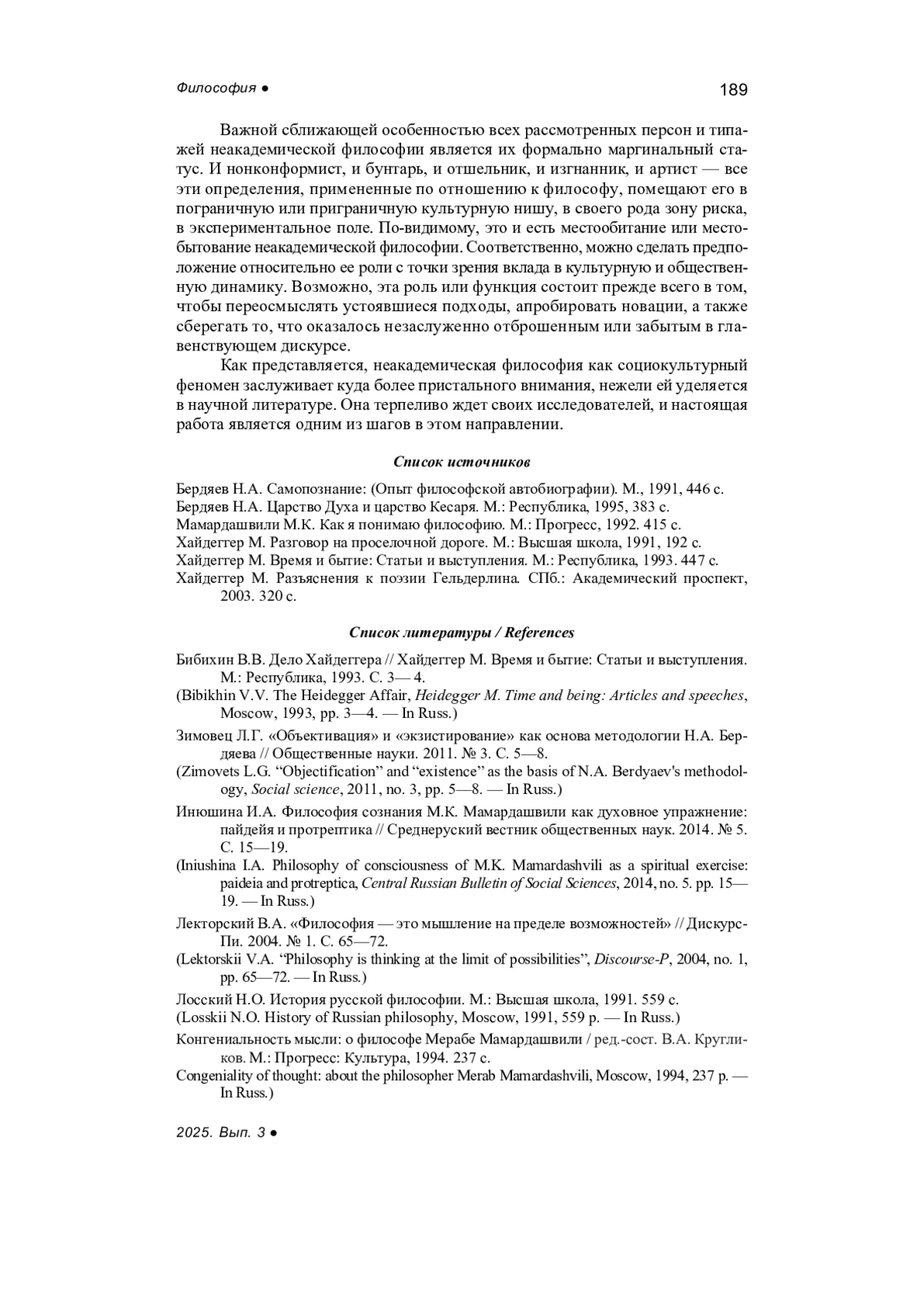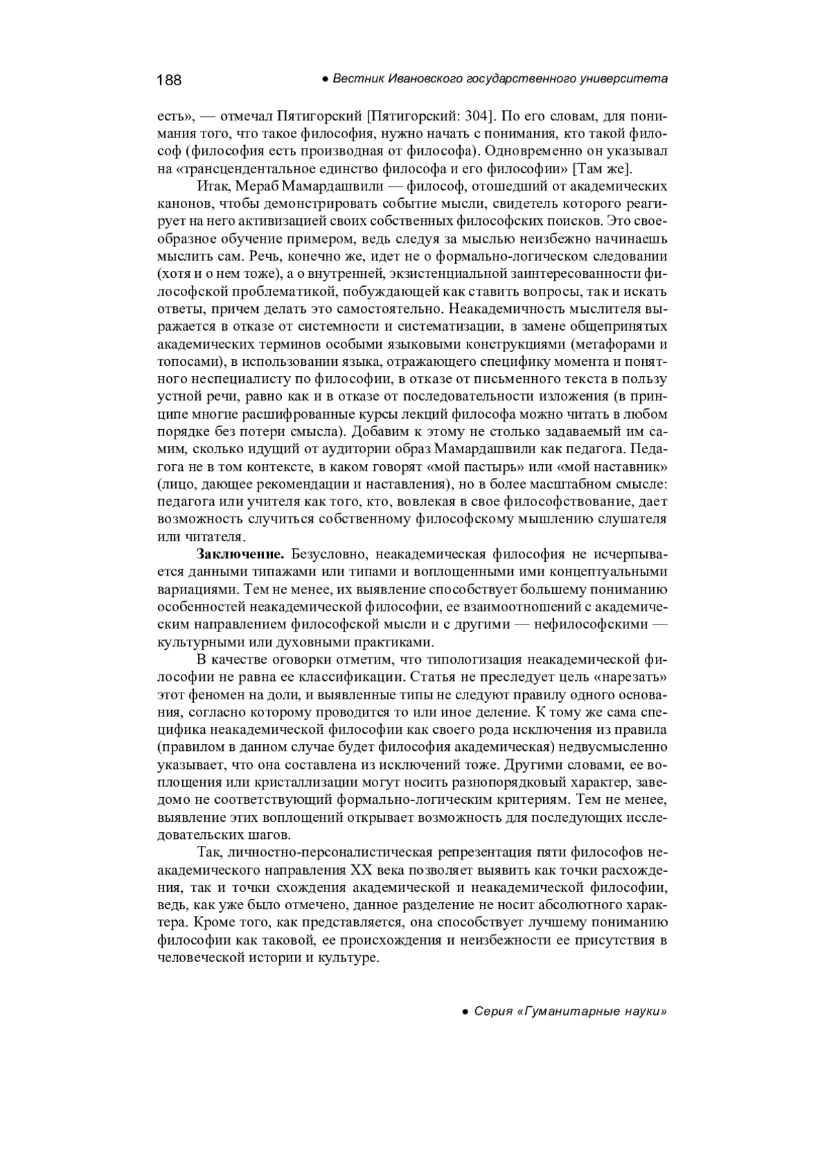 Iniushina I.A. Philosophy of consciousness of M.K. Mamardashvili as a spiritual exercise: paideia and protreptica, Central Russian Bulletin of Social Sciences, 2014, no. 5. pp. 15-19. - In Russ. EDN: TGPUSL