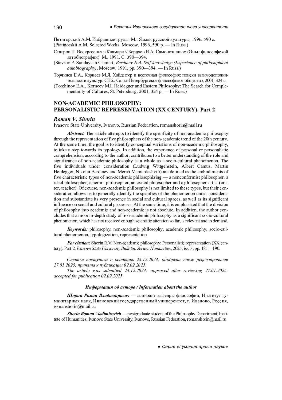 В статье предпринимается попытка выявить специфику неакадемической философии через обращение к пятерке философов неакадемического направления XX века. Автор предлагает соответствующую типологию — концептуальные вариации неакадемической философии, определенные на основе личностноперсоналистического подхода. Показано, что именно такая методология способствует лучшему пониманию роли и значению неакадемической философии в целом как социокультурного феномена. Пять персоналий — Людвиг Витгенштейн, Альбер Камю, Мартин Хайдеггер, Николай Бердяев и Мераб Мамардашвили — рассматриваются как воплощения пяти характерных типов или типажей неакадемического философствования — философ-нонконформист, философ-бунтарь, философ-отшельник, философ-изгнанник и философ-артист (оратор, учитель). Заявлено, что неакадемическая философия не исчерпывается данным типами-типажами, однако их исследование позволяет выявить специфику рассматриваемого феномена в целом, а также обосновать само его наличие в социальном и культурном пространствах. Подчеркивается, что разделение философии на академическую и неакадемическую не носит абсолютного характера. Автор делает вывод об актуальности и востребованности более глубокого изучения неакадемической философии как значимого социокультурного феномена. Зафиксировано, что этот феномен оказывает существенное влияние на общество и общественную мысль, занимая свою незаместимую нишу.