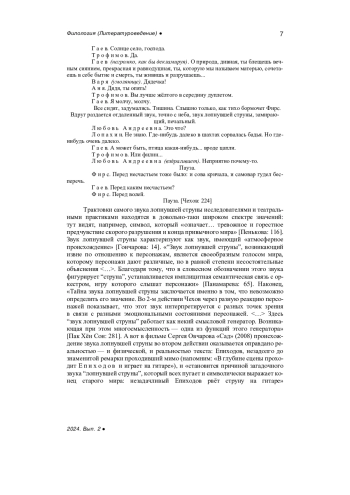 О звуке лопнувшей струны из «Вишнёвого сада» А. П. Чехова написано исследователями чеховской поэтики довольно много; более того, звук этот стал даже своего рода квинтэссенцией последней чеховской пьесы. Укажем в этой связи, например, на то, что сборник, приуроченный к столетию «Вишнёвого сада», был назван «Звук лопнувшей струны» [Чеховиана], а спустя год после его выхода вышел сборник, все статьи в котором были посвящены собственно этому звуку [Звук лопнувшей струны]. Весьма интересно специалисты-чеховеды пишут и о том, как звук лопнувшей струны отозвался в последующей культуре [Кузичева; Бушканец].