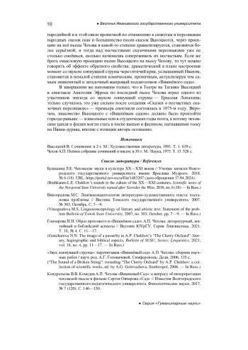 10. Панамарева А.Н. Звуковой образ мира в комедии А.П. Чехова “Вишневый сад” // Сибирский филологический журнал. 2010. № 4. С. 60-67. EDN: NCMPPH