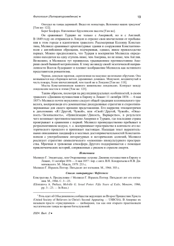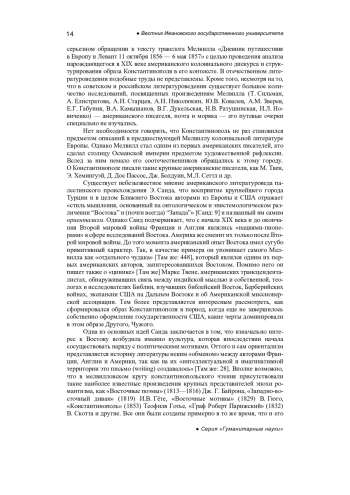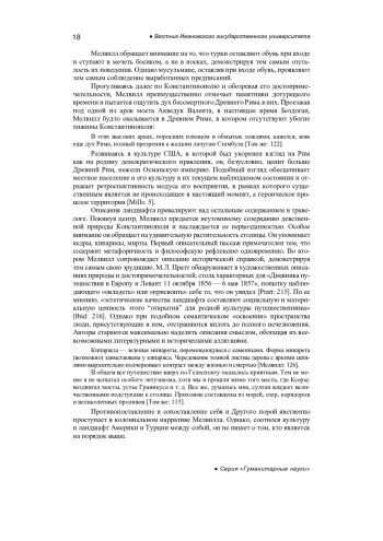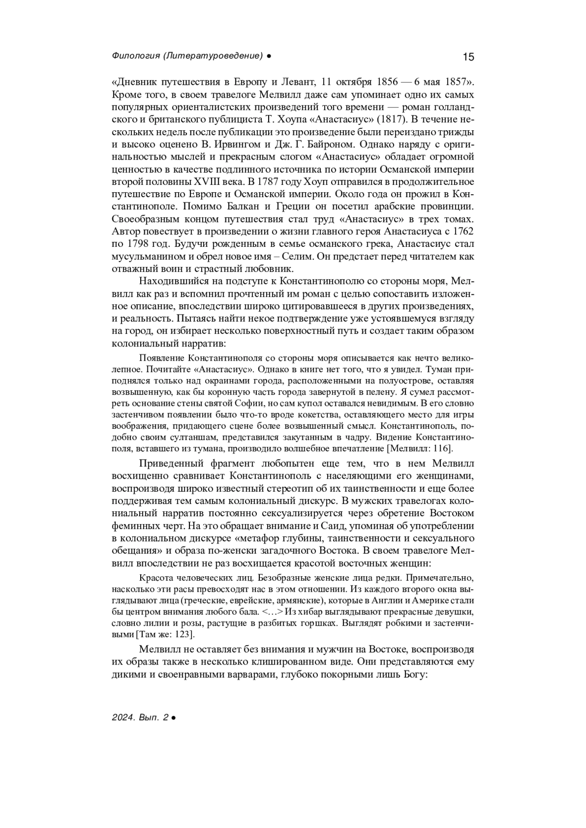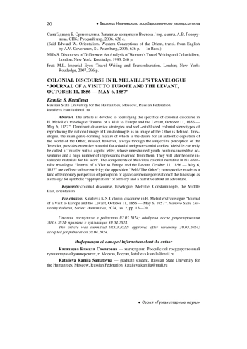 Статья посвящена выявлению специфики колониального дискурса в травелоге Г. Мелвилла «Дневник путешествия в Европу и Левант, 11 октября 1856 — 6 мая 1857». Определены доминантные дискурсивные стратегии и устоявшиеся колониальные стереотипы воспроизводства национального образа Константинополя как образа Другого, Чужого. Травелог — основной жанрообразующей чертой которого является стремление к достоверному изображению мира Другого, Чужого, пропущенного, однако, всегда через субъективное восприятие Путешественника — предоставляет обширный материал для колониальных и постколониальных исследований. Мелвилла поистине можно назвать Путешественником с большой буквы, его безудержная юность была наполнена невероятными приключениями, в которых он получил огромное количество впечатлений. Именно они станут впоследствии бесценным материалом для его творчества. Определены составляющие колониального нарратива Мелвилла в его ориенталистском травелоге «Дневник путешествия в Европу и Левант…»: этноцентричность; оппозиция «Я / Другой, Чужой», или «Свой / Другой, Чужой»; ретроспективный модус как своеобразная временная перспектива восприятия пространства; нарочитое поэтизирование ландшафта как стратегия символического «присвоения» территории и повествование об авантюрном приключении.
