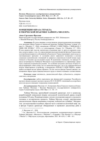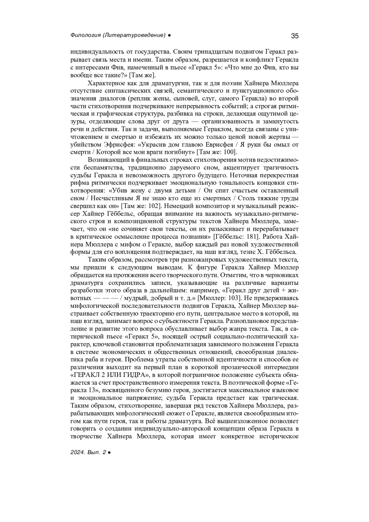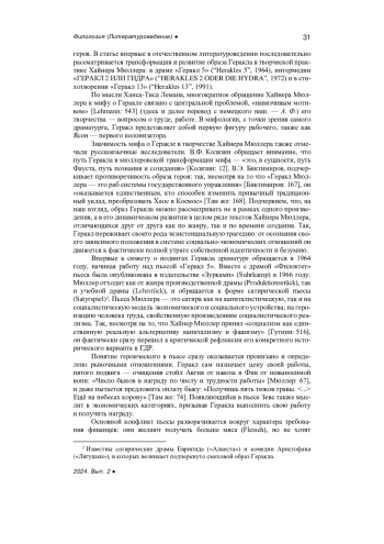 В статье впервые в отечественном литературоведении рассматривается эволюция образа Геракла в творческой практике Хайнера Мюллера: в драме «Геракл 5» (“Herakles 5”, 1964), интермедии «ГЕРАКЛ 2 ИЛИ ГИДРА» (“HERAKLES 2 ODER DIE HYDRA”, 1972) и в стихотворении «Геракл 13» (“Herakles 13”, 1991). В ходе анализа трёх текстов, значительно отдаленных друг от друга по времени создания, делается вывод о том, что определяющим вектором развития фигуры Геракла является проблематизация его собственной субъектности. Геракл переживает своего рода экзистенциальную трагедию: от осознания своего зависимого положения в системе социально-экономических отношений он движется к фактически полной потере идентичности и безумию как последней стадии. В заключение отмечается, что фигура Геракла историзируется Хайнером Мюллером и рассматриваются в современных драматургу социально-политических реалиях. Это особенно актуально для пьесы «Геракл 5», представляющей собой сатиру как на капиталистическую, так и на социалистическую модель общественного устройства, и интермедии «ГЕРАКЛ 2 ИЛИ ГИДРА», являющейся составной частью драмы «Цемент». В этих текстах фигура Геракла связана с воплощением образа героя социалистического труда и «нового человека» соответственно