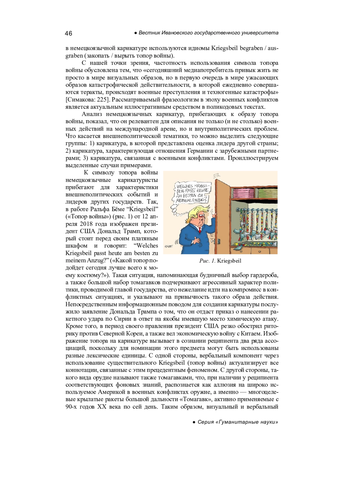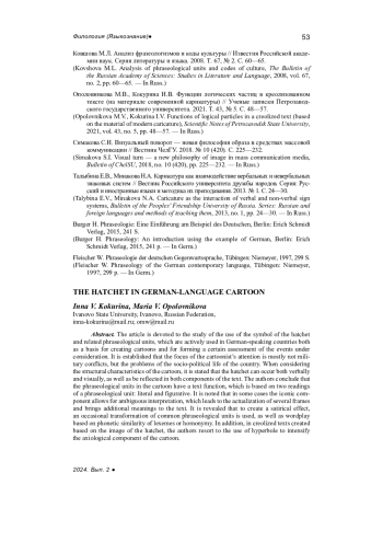 Статья посвящена исследованию использования символа топора войны и связанных с ним фразеологизмов, которые активно используются в немецкоязычных странах как в качестве основы для создания карикатуры, так и для формирования определенной оценки рассматриваемых событий. Устанавливается, что в фокусе внимания художников оказываются по большей части не военные конфликты, а проблемы социально-политической жизни страны. При рассмотрении структурных характеристик карикатуры констатируется, что топор войны может встречаться как в вербальной, так и в визуальной части, а также находить отражение в обоих компонентах текста. Авторы приходят к выводу, что фразеологизмы в карикатуре обладают текстообразующей функцией, которая строится на двух прочтениях устойчивого выражения: буквальном и фигуральном. Отмечается, что в ряде случаев иконический компонент допускает неоднозначную интерпретацию, что приводит к актуализации нескольких фреймов и привносит в текст дополнительные смыслы. Выясняется, что для создания сатирического эффекта используется окказиональная трансформация узуальных фразеологических единиц, а также игра слов, основанная на фонетическом подобии лексем или омонимии. Кроме того, в креолизованных текстах, созданных с опорой на образ топора войны, авторы прибегают к использованию гиперболы для интенсификации аксиологической составляющей карикатуры