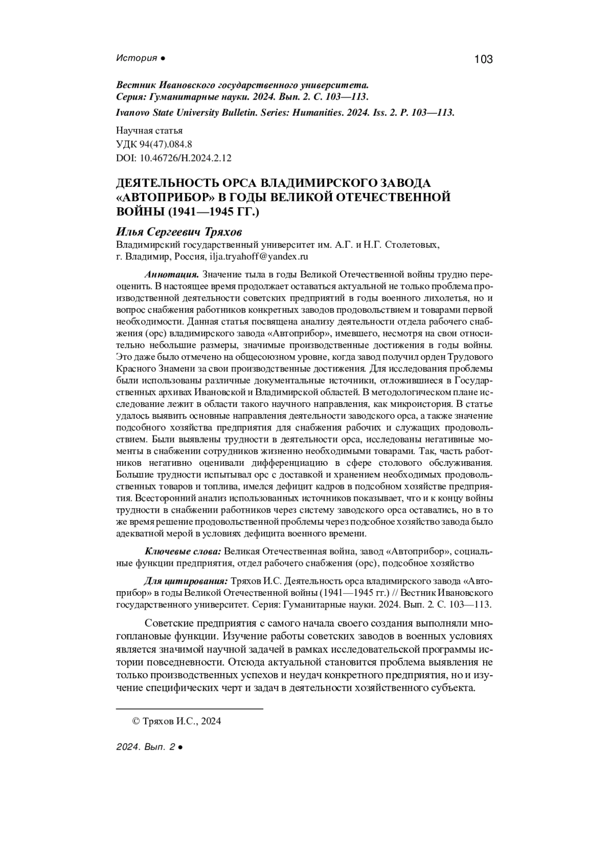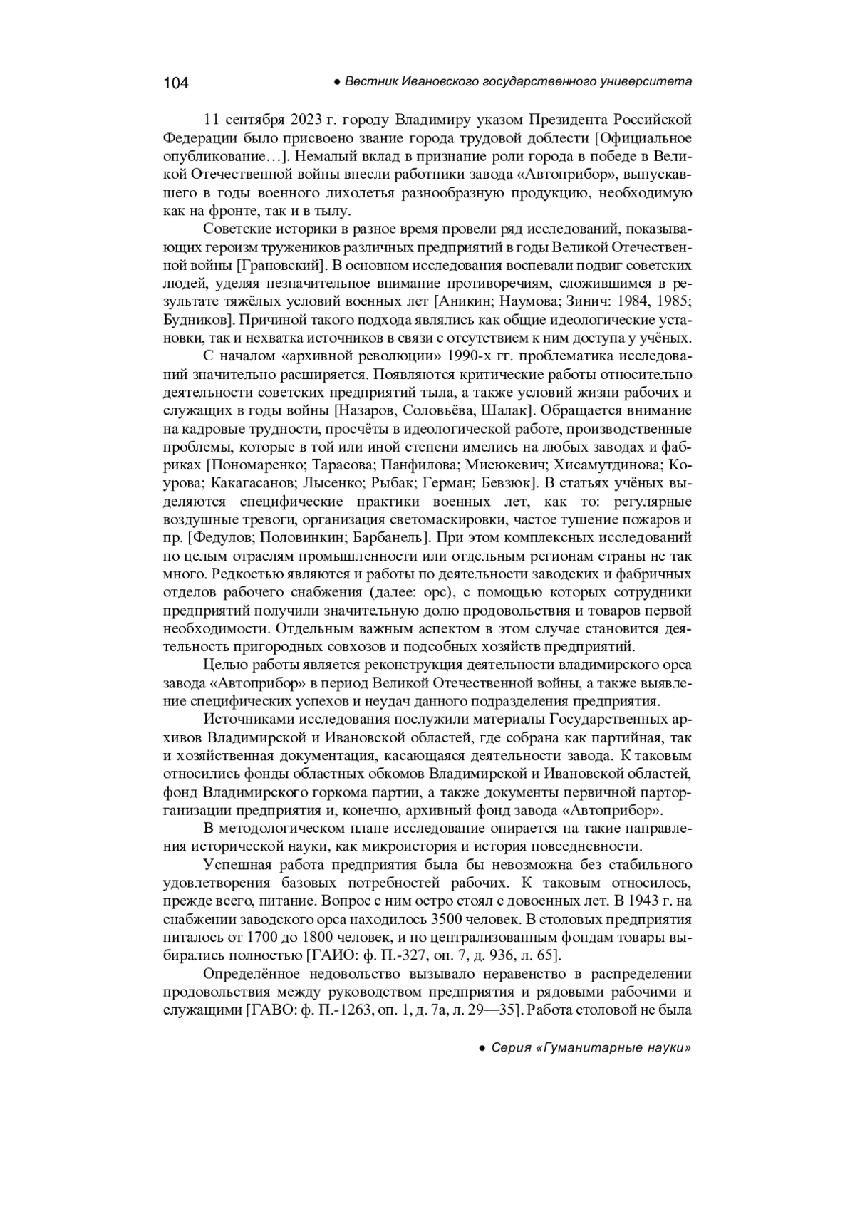 Значение тыла в годы Великой Отечественной войны трудно переоценить. В настоящее время продолжает оставаться актуальной не только проблема производственной деятельности советских предприятий в годы военного лихолетья, но и вопрос снабжения работников конкретных заводов продовольствием и товарами первой необходимости. Данная статья посвящена анализу деятельности отдела рабочего снабжения (орс) владимирского завода «Автоприбор», имевшего, несмотря на свои относительно небольшие размеры, значимые производственные достижения в годы войны. Это даже было отмечено на общесоюзном уровне, когда завод получил орден Трудового Красного Знамени за свои производственные достижения. Для исследования проблемы были использованы различные документальные источники, отложившиеся в Государственных архивах Ивановской и Владимирской областей. В методологическом плане исследование лежит в области такого научного направления, как микроистория. В статье удалось выявить основные направления деятельности заводского орса, а также значение подсобного хозяйства предприятия для снабжения рабочих и служащих продовольствием. Были выявлены трудности в деятельности орса, исследованы негативные моменты в снабжении сотрудников жизненно необходимыми товарами. Так, часть работников негативно оценивали дифференциацию в сфере столового обслуживания. Большие трудности испытывал орс с доставкой и хранением необходимых продовольственных товаров и топлива, имелся дефицит кадров в подсобном хозяйстве предприятия. Всесторонний анализ использованных источников показывает, что и к концу войны трудности в снабжении работников через систему заводского орса оставались, но в то же время решение продовольственной проблемы через подсобное хозяйство завода было адекватной мерой в условиях дефицита военного времени