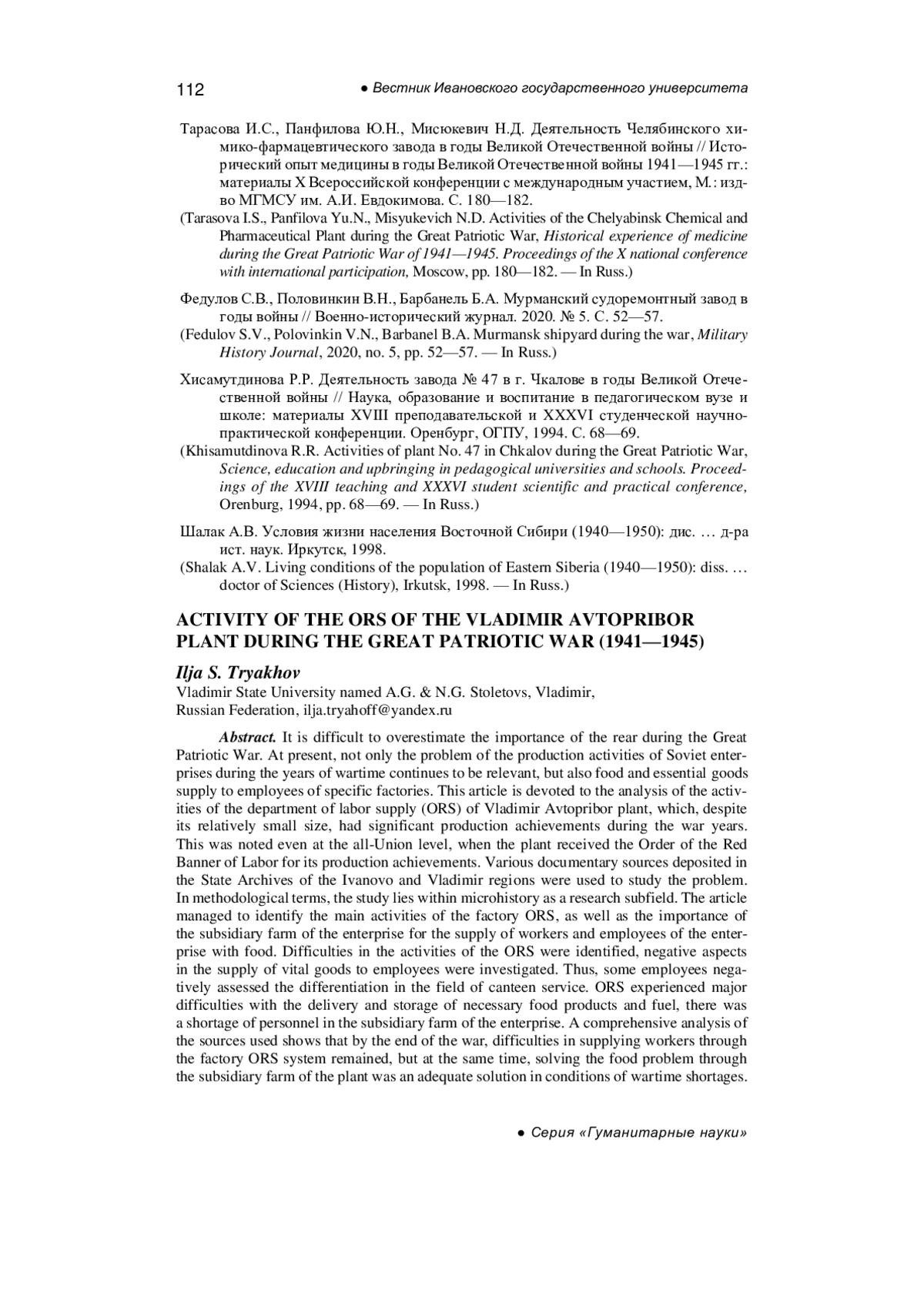 German Y.S. Activities of the Orsk Oil Refinery during the Great Patriotic War), The Great Patriotic War in Memory of Generations. Sat. materials international. scientific-practical conf. Sterlitamak, 2020, pp. 111-115. - In Russ.