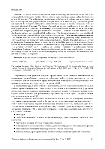 Results. The article provides a review of literature on demographic factors in mental warfare. It should be noted that the active and deliberate dissemination of demographic attitudes intended to alter the long-standing cultural and family values of a potential adversary can be considered an essential component of psychological warfare.