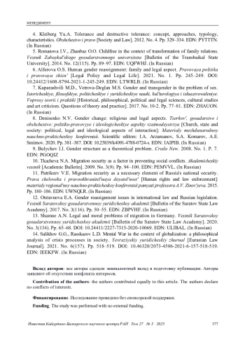 7. Алферова О. С. Смена пола человека: семейно-правовой аспект // Правовая политика и правовая жизнь. 2021. № 1. С. 245-249. DOI: 10.24412/1608-8794-2021-1-245-249 EDN: LTWRLB