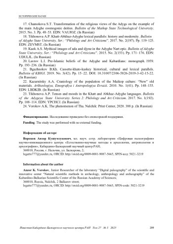 2. Вороков А. К. К интерпретации надписей сосуда № 1 из кургана Ошад майкопской культуры // Известия Кабардино-Балкарского научного центра РАН. 2024. Т. 26. № 5. С. 230-250. DOI: 10.35330/1991-6639-2024-26-5-230-250 EDN: SIZXMZ