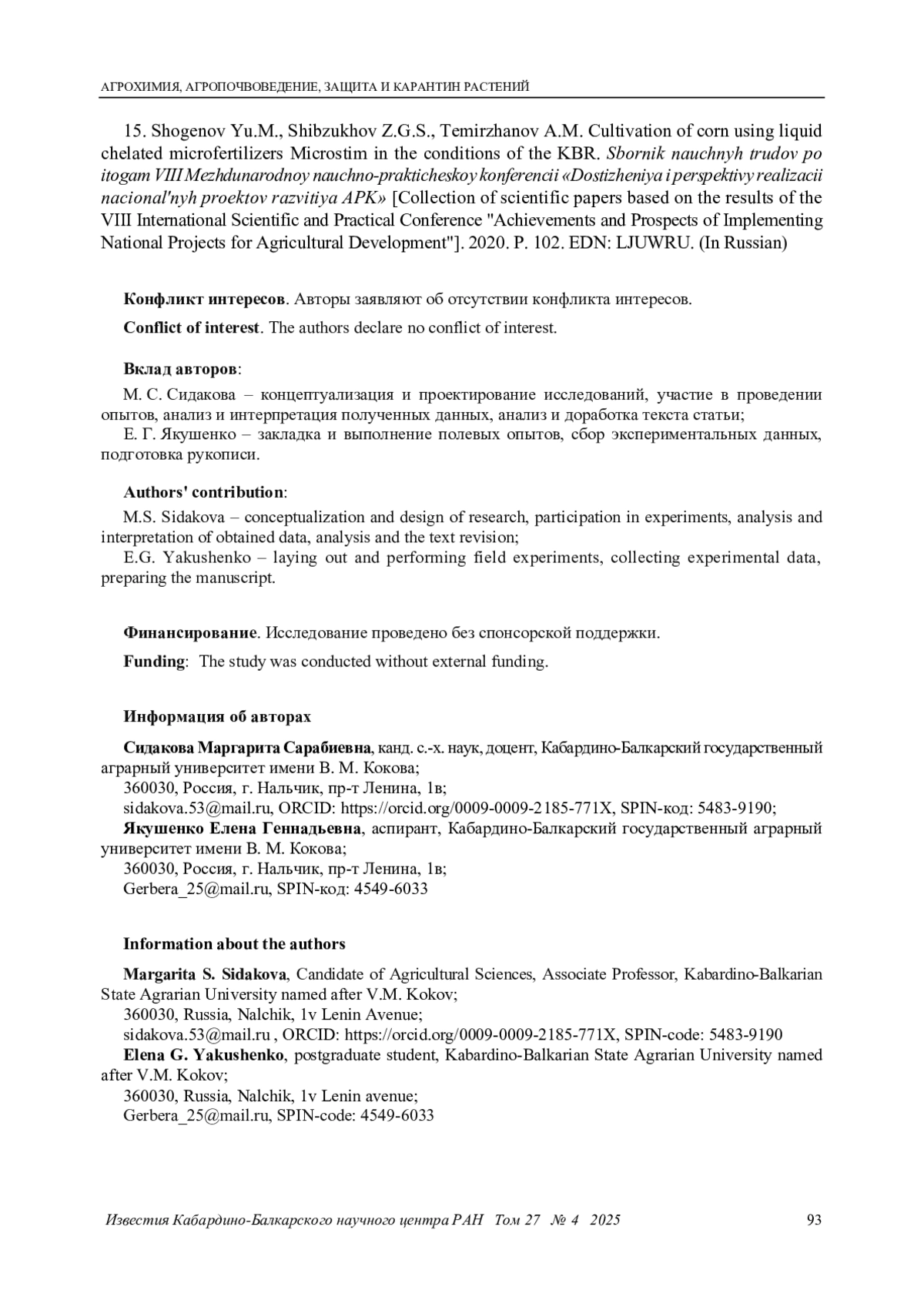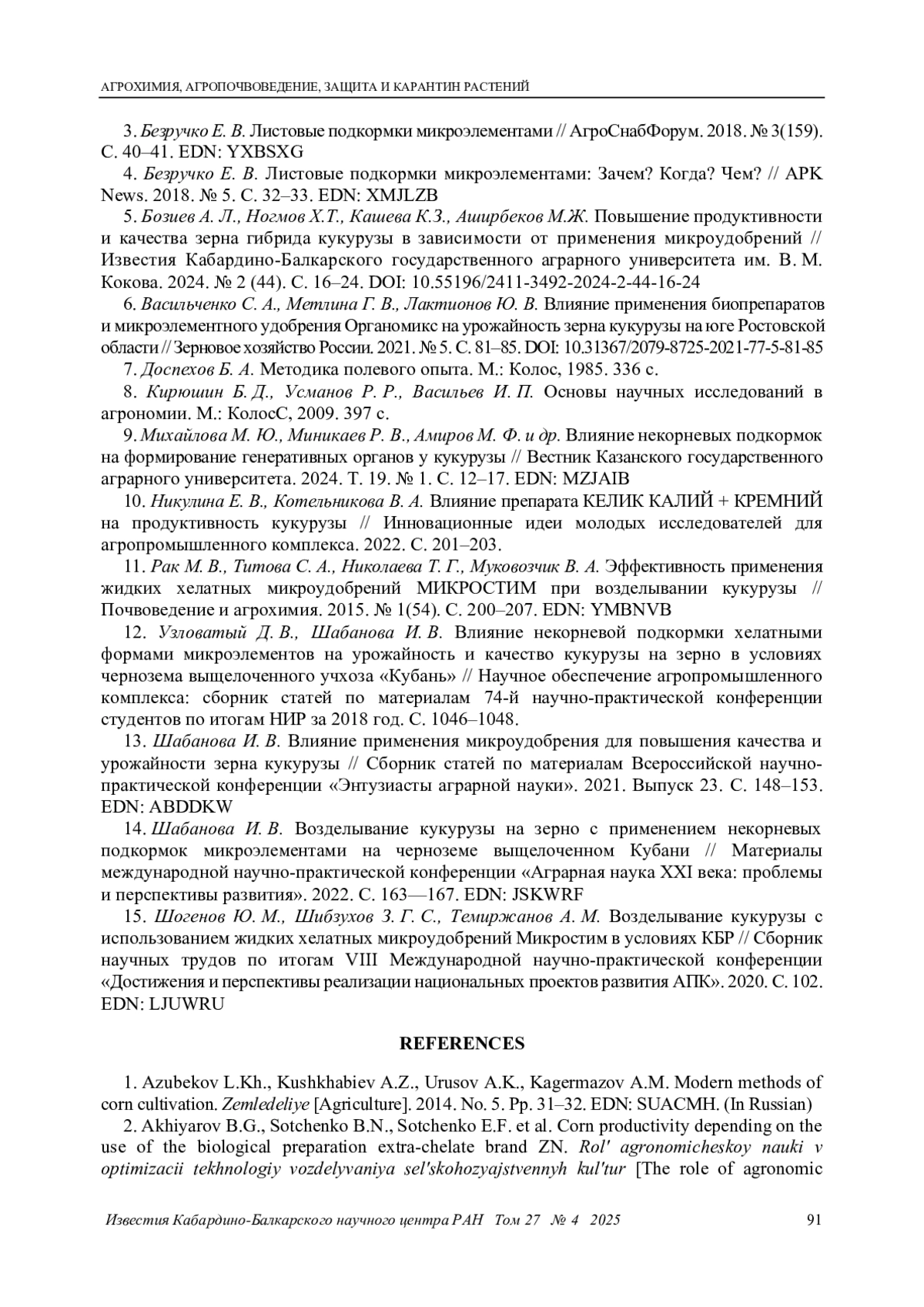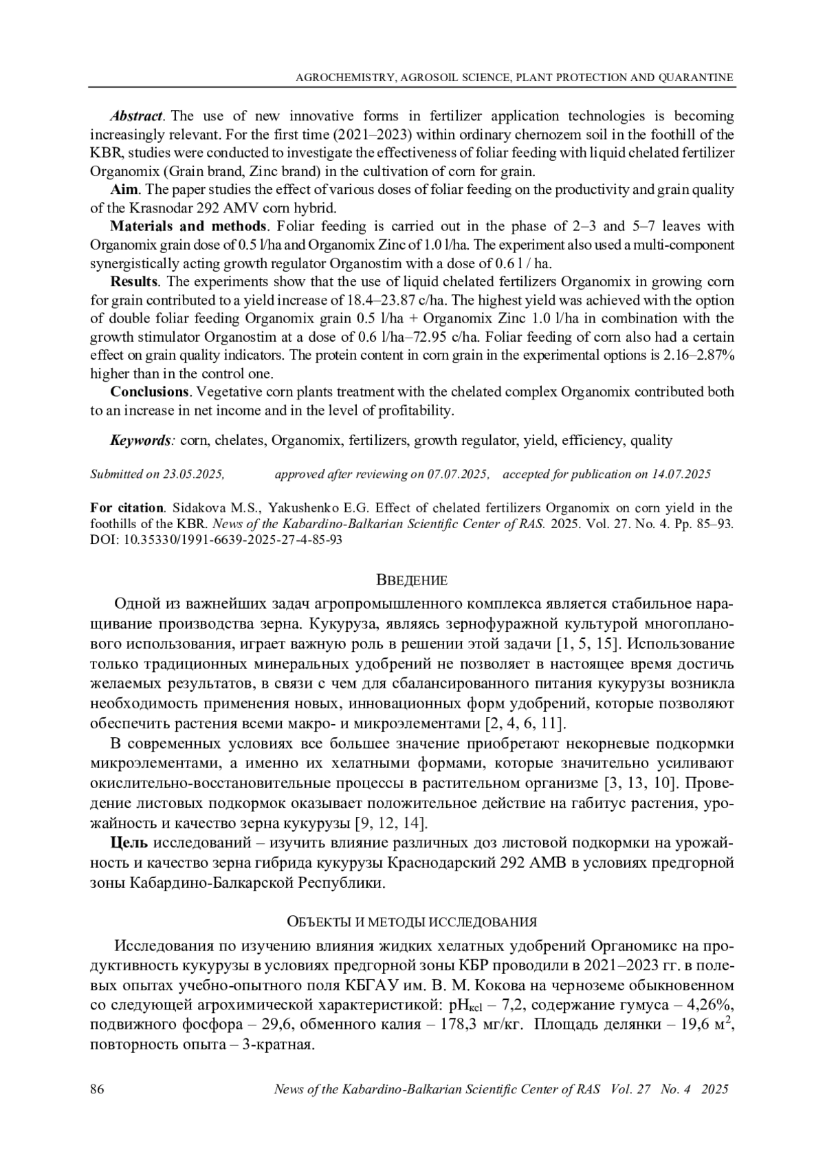 СИДАКОВА М. С., ЯКУШЕНКО Е. Г. ВЛИЯНИЕ ХЕЛАТНЫХ УДОБРЕНИЙ ОРГАНОМИКС НА УРОЖАЙНОСТЬ КУКУРУЗЫ В УСЛОВИЯХ ПРЕДГОРНОЙ ЗОНЫ КБР // ИЗВЕСТИЯ КАБАРДИНО-БАЛКАРСКОГО НАУЧНОГО ЦЕНТРА РАН. 2025. ТОМ 27 № 4