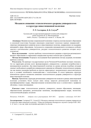 Внешние вызовы в национальной экономике и переход системы высшего образования к усиленной подготовке будущих инженеров затрагивают несколько важных направлений - структуру инновационного развития вузов и инвестиционную политику, направленную на поддержку инноваций в сфере образования. Актуальность сохранения инновационного потенциала особенно заметна в региональных университетах, ресурсы технологического развития которых могут отличаться.