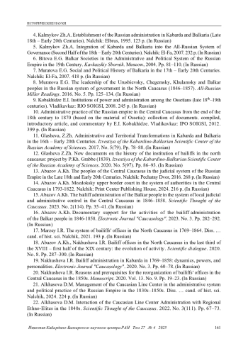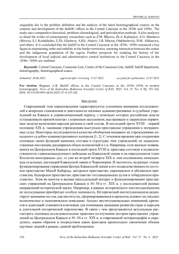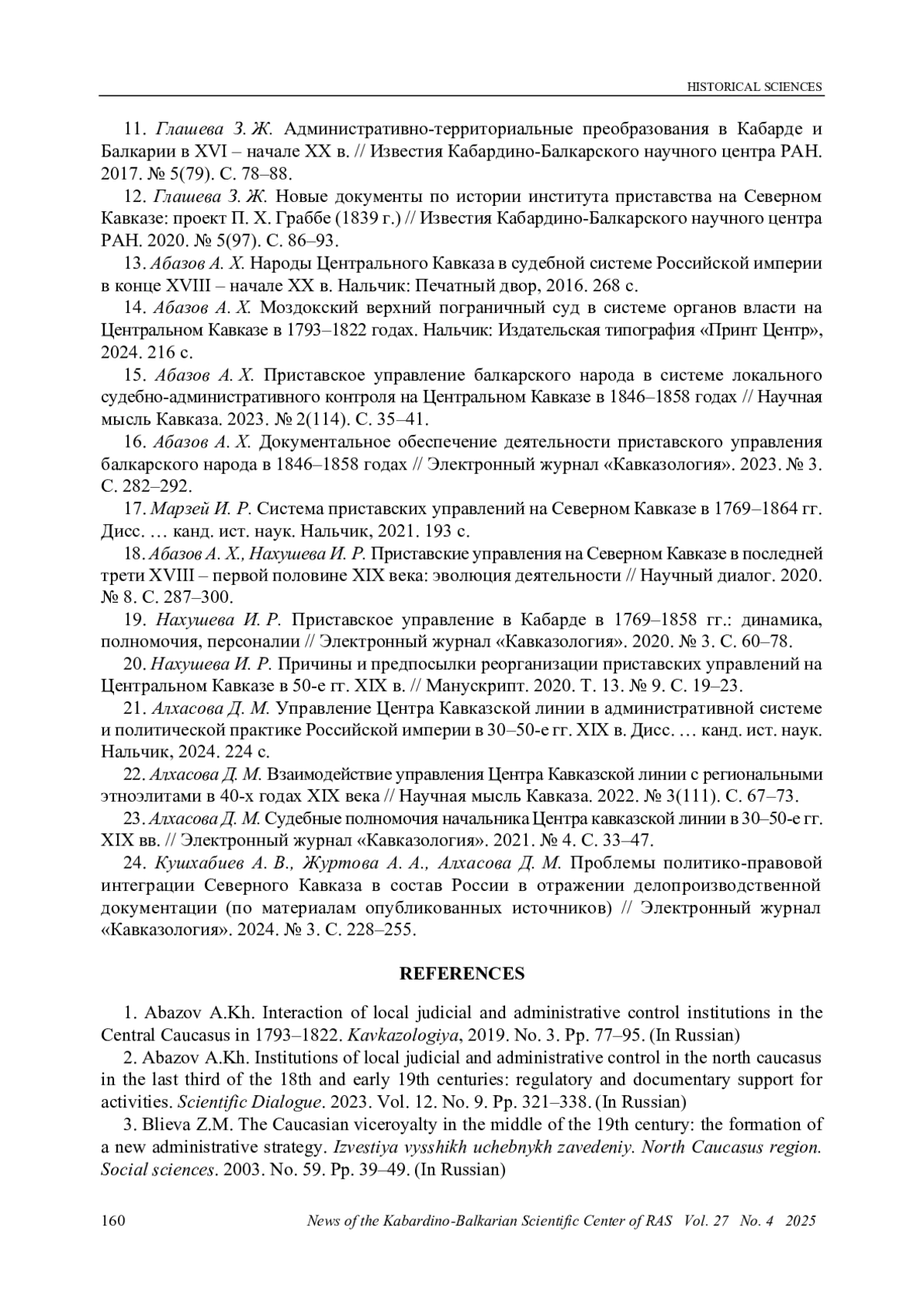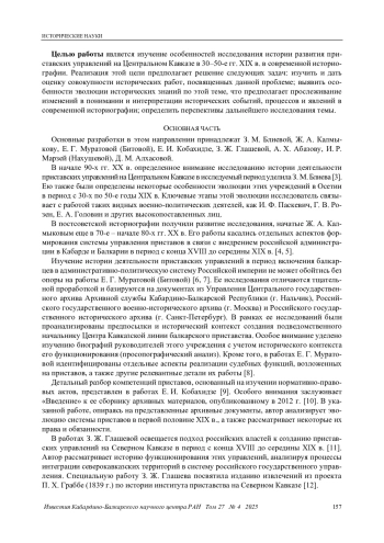 БЕППАЕВ А. Р. ПРИСТАВСКИЕ УПРАВЛЕНИЯ НА ЦЕНТРАЛЬНОМ КАВКАЗЕ В 30-50-Е ГГ. XIX В. В СОВРЕМЕННОЙ ИСТОРИОГРАФИИ // ИЗВЕСТИЯ КАБАРДИНО-БАЛКАРСКОГО НАУЧНОГО ЦЕНТРА РАН. 2025. ТОМ 27 № 4