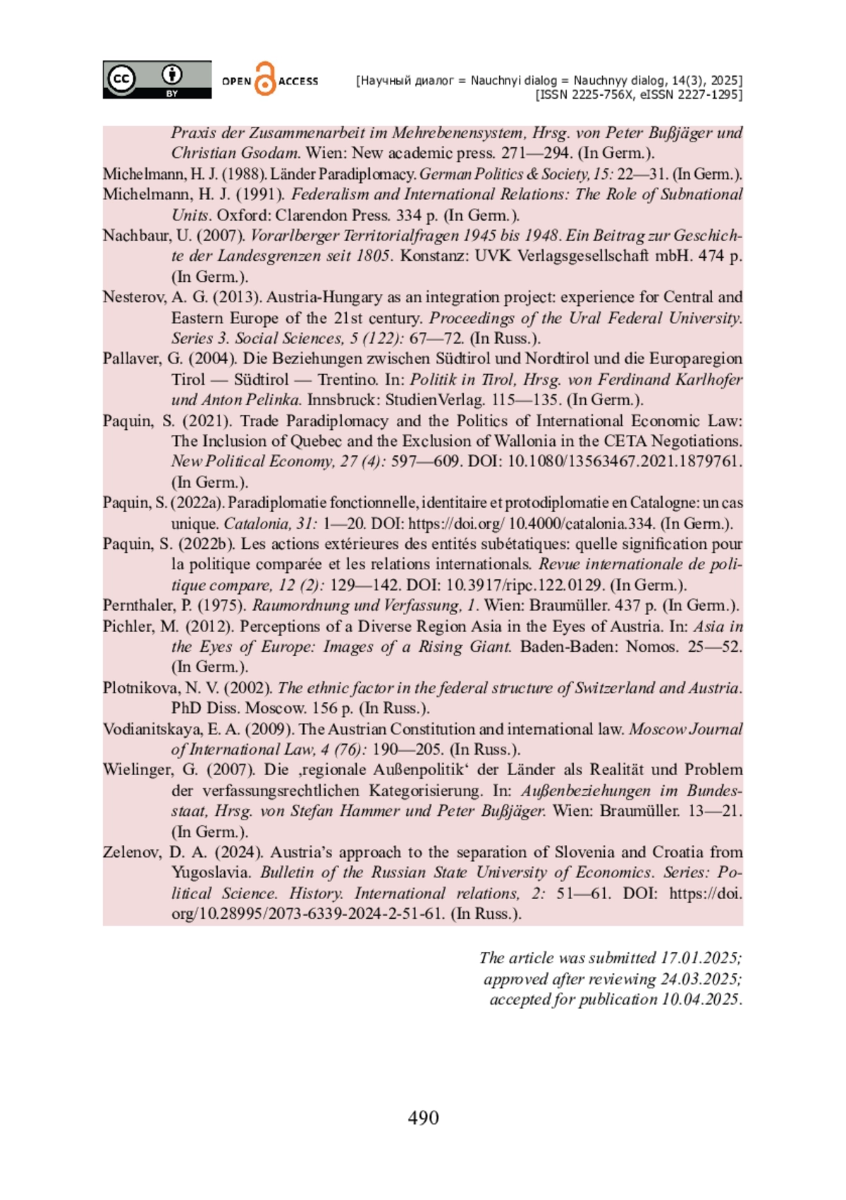 4. Зеленов Д. А. Подход Австрии к отделению Словении и Хорватии от Югославии / Д. А. Зеленов // Вестник РГГУ. Серия : Политология. История. Международные отношения. - 2024. - № 2. - С. 51-61. - https://doi.org/10.28995/2073-6339-2024-2-51-61.