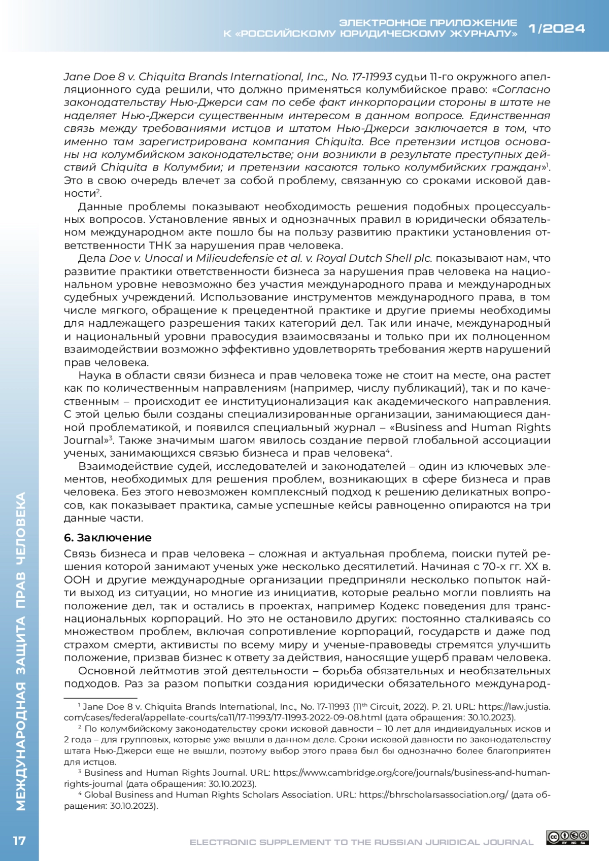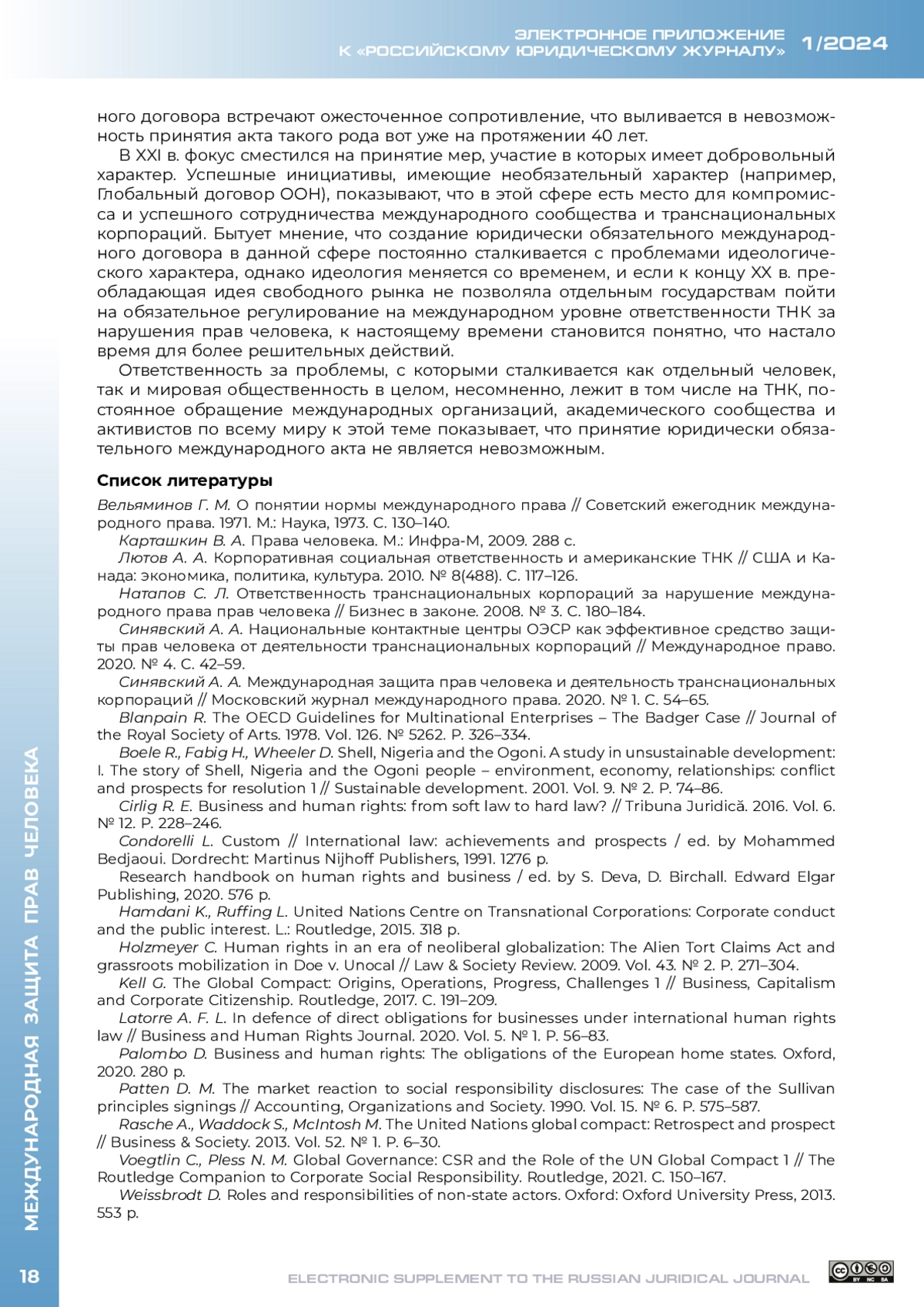 В статье рассматривается развитие института ответственности бизнеса за нарушение прав человека. Отмечается, что защита прав человека являлась одним из основных направлений развития международного права в XX в., что привело в том числе к расширению состава субъектов, которые несут ответственность за соблюдение прав человека. Упоминается деятельность Центра по транснациональным корпорациям ООН, основная задача которого заключалась в разработке Кодекса поведения для ТНК, который предлагал уважать права человека и основные свободы. Дальнейшее развитие института ответственности бизнеса за соблюдение прав человека связывается с принятием Руководящих принципов для многонациональных предприятий ОЭСР, Глобального договора ООН, а также Норм, касающихся ответственности транснациональных корпораций и других предприятий в области прав человека, на основе которых позже предполагалось принять юридически обязательный документ. Деятельность Специального представителя Генерального секретаря по вопросу о правах человека и транснациональных корпорациях и других предприятиях, кульминацией работы которого стала разработка Руководящих принципов предпринимательской деятельности в аспекте прав человека ООН, оказала большое влияние на развитие института ответственности бизнеса за соблюдение прав человека. Среди других ключевых событий можно назвать борьбу народа Огони с корпорацией «Shell», а также создание Принципов Салливана. Деятельность судей в США и Европе и нормотворчество на уровне ЕС также развивает и расширяет ответственность ТНК. Автор подчеркивает ключевую тенденцию нормотворчества в сфере ответственности бизнеса за нарушение прав человека - борьбу юридически обязательных и необязательных подходов, которая каждый раз приводит к отказу от принятия юридически обязательного международного акта в данной сфере.