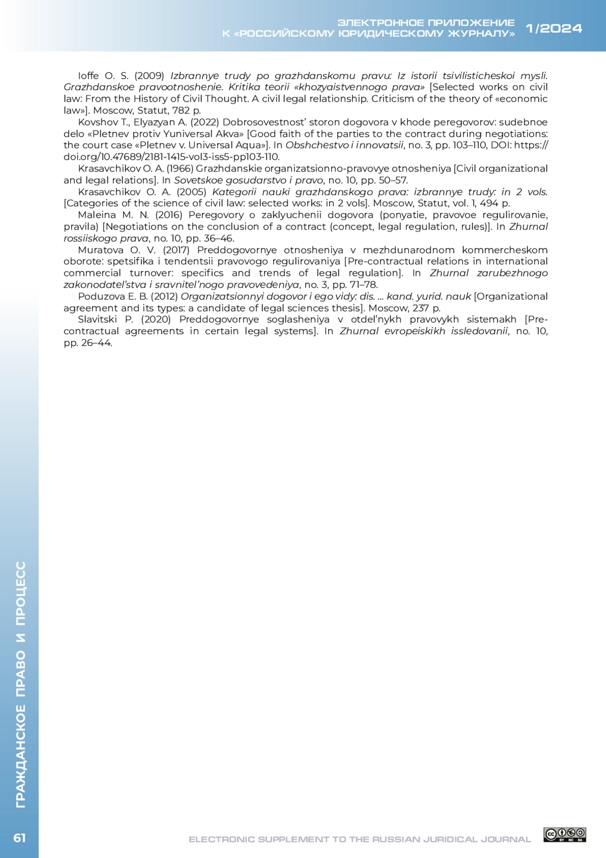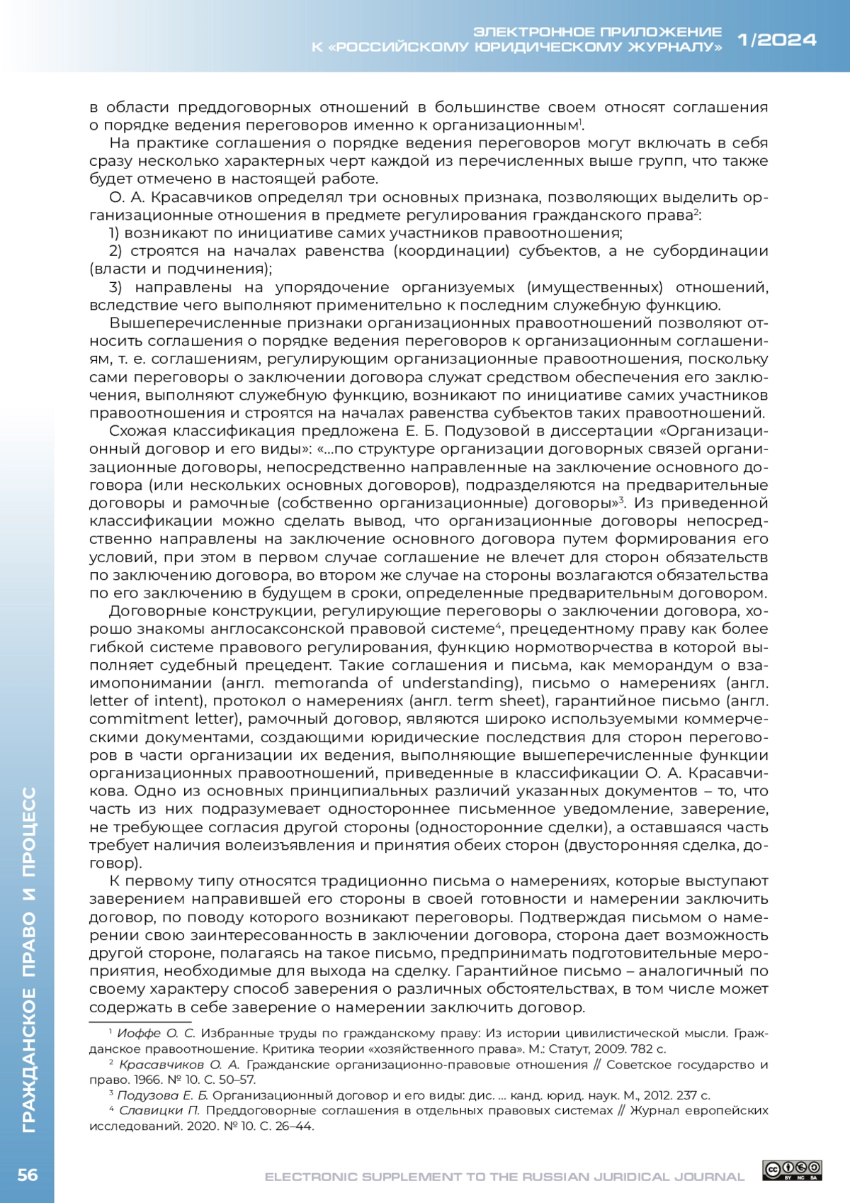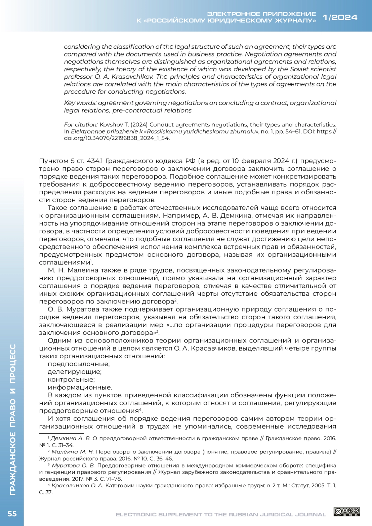 В данной статье освещается тема соглашений о порядке ведения переговоров, их разнообразие и особенности. Приводится краткий обзор различных типов соглашений о переговорах, а также анализируются их основные характеристики. Автор выделяет основные содержательные аспекты таких соглашений и обращает внимание на их роль как инструмента регулирования взаимодействия сторон в процессе переговоров. Оценивается практическое применение соглашений о порядке ведения переговоров в различных сферах деятельности, выявляются особенности их использования в различных контекстах. Выделяются существующие типы и виды используемых в практике урегулирования переговоров о заключении договора соглашений, писем, такие как меморандумы о взаимопонимании, гарантийные письма, письма о намерениях, преддоговорные соглашения, протоколы и т. п. Также приводятся существующие точки зрения теоретиков на природу соглашений, говорится об их роли и важности в урегулировании переговоров. При рассмотрении классификации правовой структуры данного соглашения их виды сопоставляются с используемыми в практике делового оборота документами. Соглашения о ведении переговоров и сами переговоры выделяются в качестве организационных соглашений и отношений соответственно, теория о существовании которых была разработана советским ученым профессором О. А. Красавчиковым. Принципы и характеристика организационных правоотношений соотнесены с основными характеристиками видов соглашений о порядке ведения переговоров.
