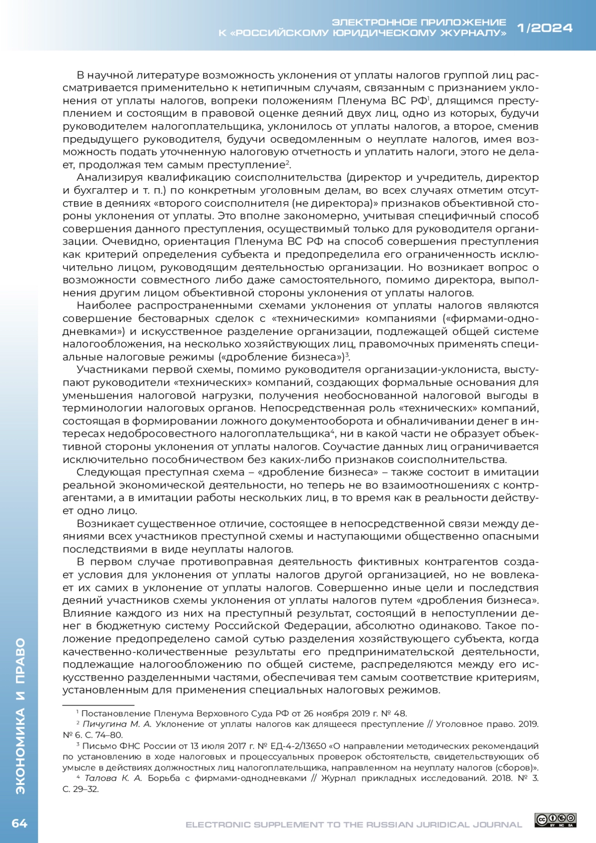 2. Пичугина М. А. Уклонение от уплаты налогов как длящееся преступление // Уголовное право. 2019. № 6. С. 74-80. EDN: JMOVTH