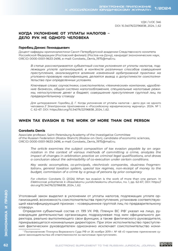 В статье рассматривается субъектный состав уклонения от уплаты налогов, подлежащих уплате организацией, в контексте различных способов совершения преступления, анализируется влияние изменений арбитражной практики на уголовно-правовую квалификацию, делается вывод о допустимости соисполнительства при определенных условиях.