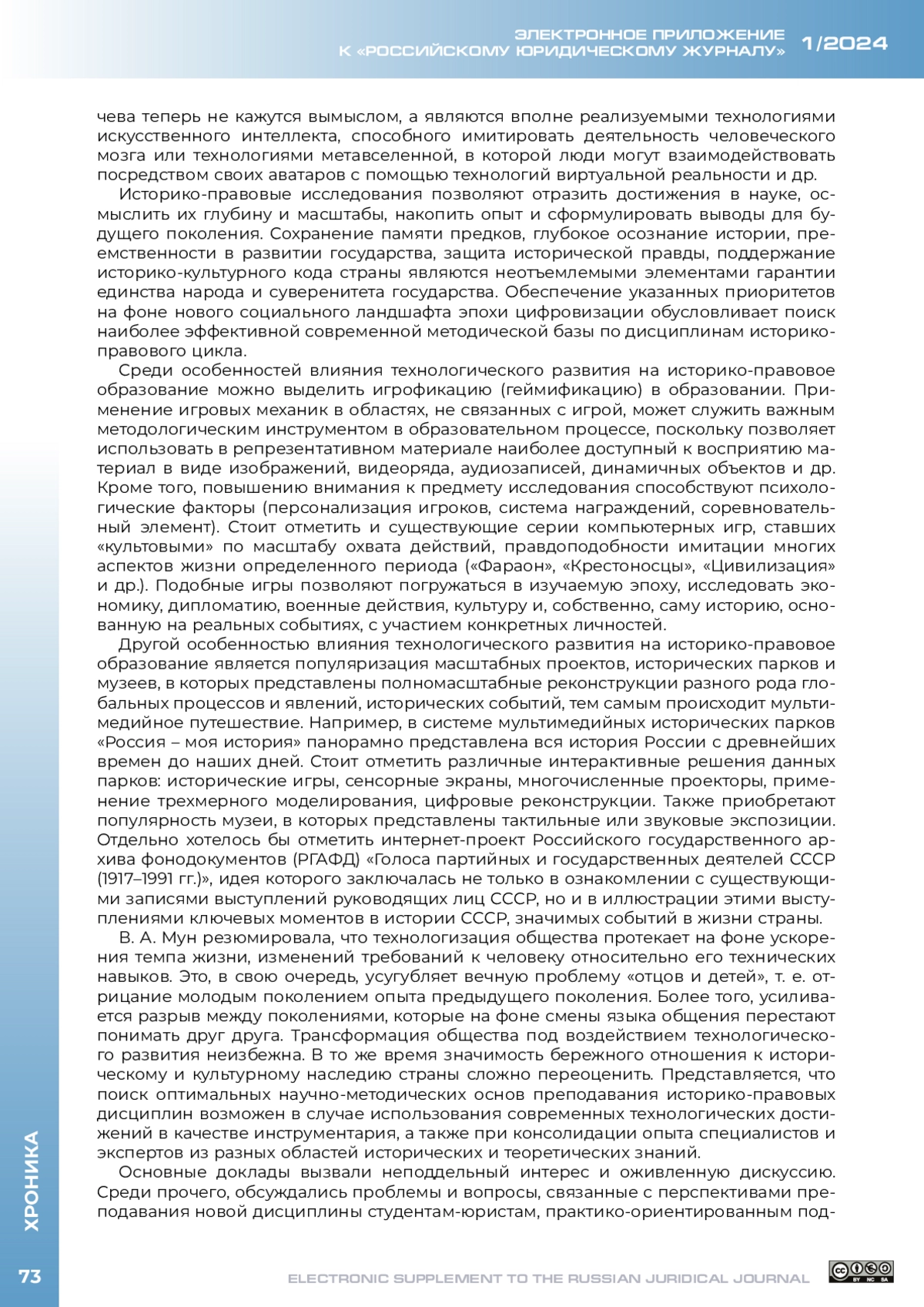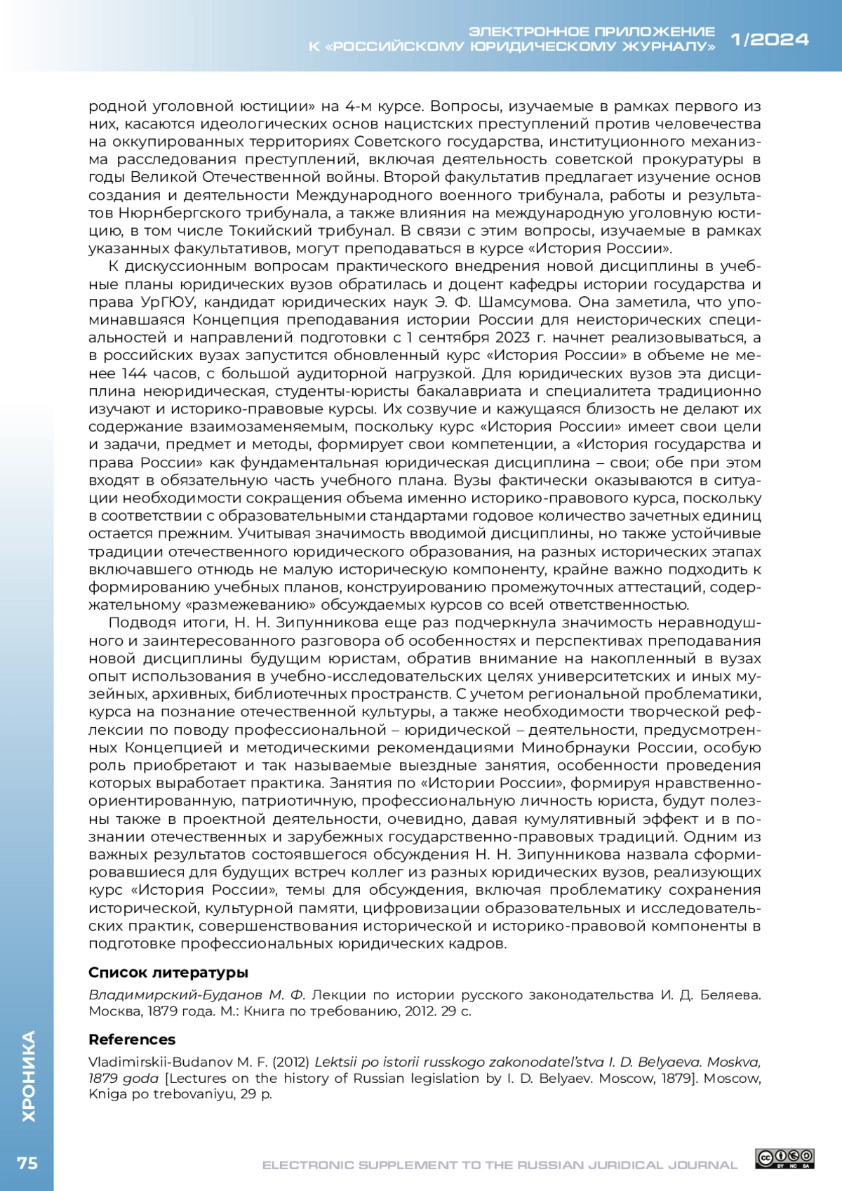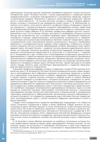 27 июня 2023 г. в онлайн-формате состоялся межвузовский круглый стол на тему «Научно-методические основы преподавания курса „История России“ в юридических вузах». Инициатором мероприятия выступила кафедра истории государства и права Уральского государственного юридического университета им. В. Ф. Яковлева (далее – УрГЮУ), соорганизатором – кафедра истории государства и права Саратовской государственной юридической академии (далее – СГЮА); к дискуссии присоединились историки и историки права из других вузов страны. Актуальность обсуждения проблематики расширения исторической компоненты в подготовке будущих юристов обусловлена рядом причин, прежде всего введением с 1 сентября 2023 г. во всех вузах страны на неисторических специальностях и направлениях подготовки обязательной дисциплины «История России».