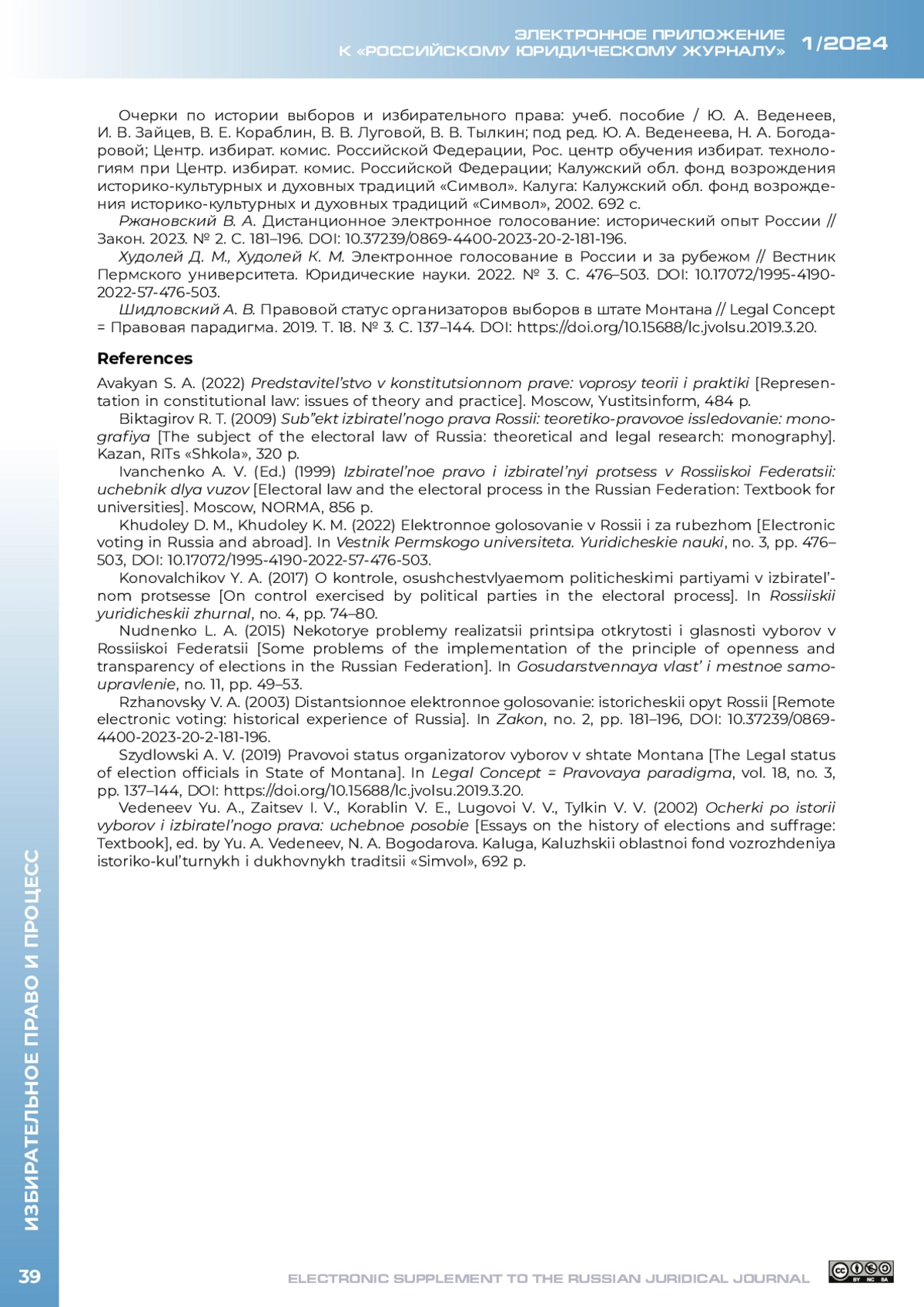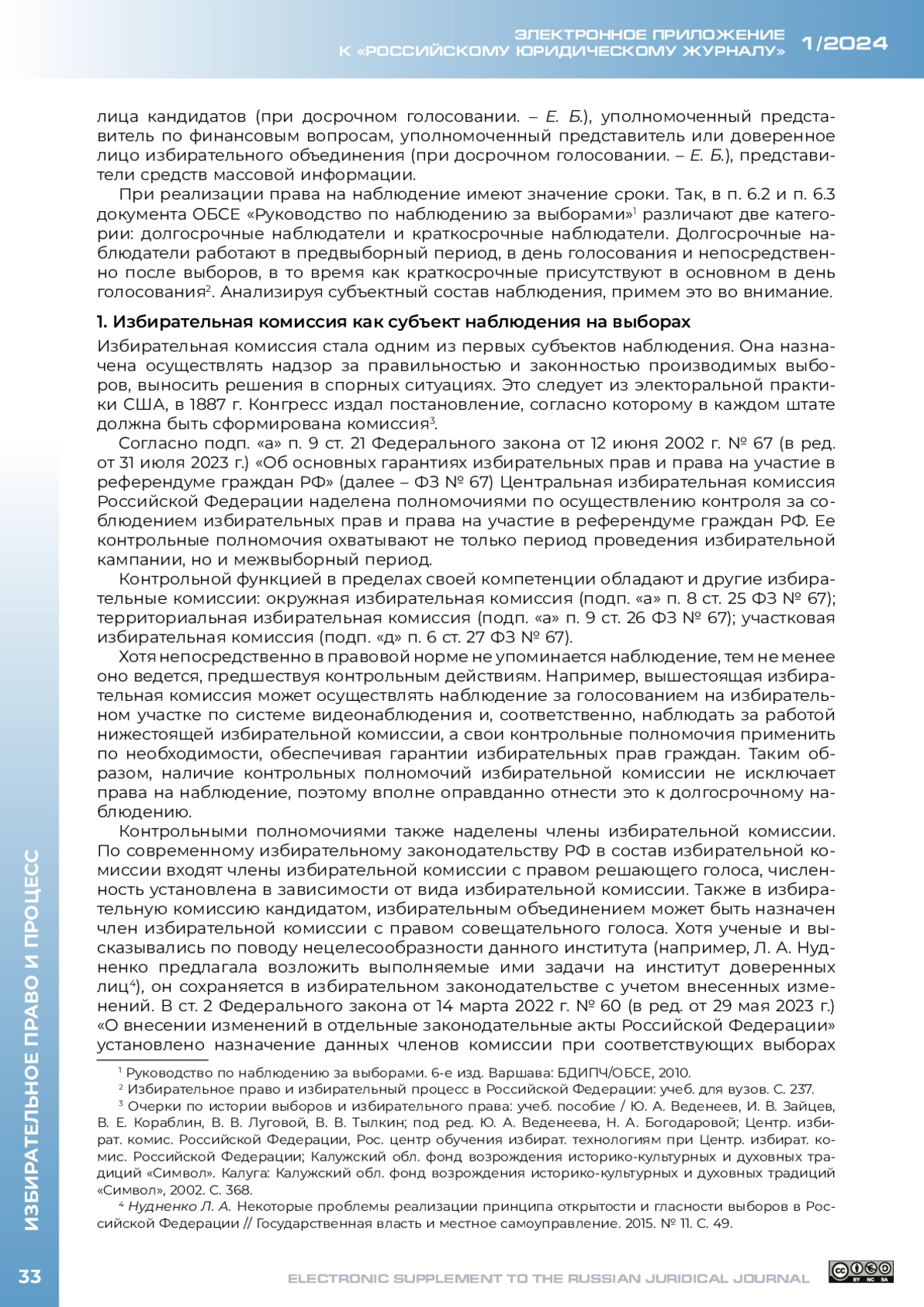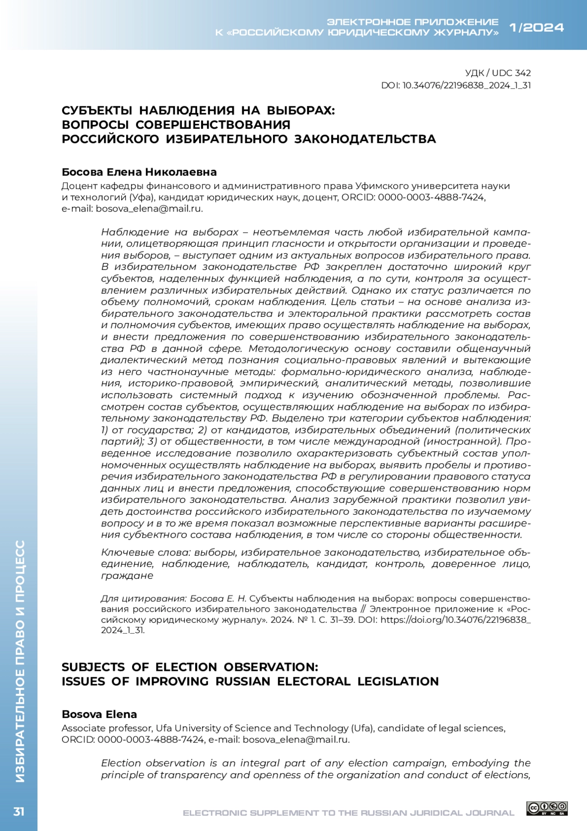 Наблюдение на выборах - неотъемлемая часть любой избирательной кампании, олицетворяющая принцип гласности и открытости организации и проведения выборов, - выступает одним из актуальных вопросов избирательного права. В избирательном законодательстве РФ закреплен достаточно широкий круг субъектов, наделенных функцией наблюдения, а по сути, контроля за осуществлением различных избирательных действий. Однако их статус различается по объему полномочий, срокам наблюдения. Цель статьи - на основе анализа избирательного законодательства и электоральной практики рассмотреть состав и полномочия субъектов, имеющих право осуществлять наблюдение на выборах, и внести предложения по совершенствованию избирательного законодательства РФ в данной сфере. Методологическую основу составили общенаучный диалектический метод познания социально-правовых явлений и вытекающие из него частнонаучные методы: формально-юридического анализа, наблюдения, историко-правовой, эмпирический, аналитический методы, позволившие использовать системный подход к изучению обозначенной проблемы. Рассмотрен состав субъектов, осуществляющих наблюдение на выборах по избирательному законодательству РФ. Выделено три категории субъектов наблюдения: 1) от государства; 2) от кандидатов, избирательных объединений (политических партий); 3) от общественности, в том числе международной (иностранной). Проведенное исследование позволило охарактеризовать субъектный состав уполномоченных осуществлять наблюдение на выборах, выявить пробелы и противоречия избирательного законодательства РФ в регулировании правового статуса данных лиц и внести предложения, способствующие совершенствованию норм избирательного законодательства. Анализ зарубежной практики позволил увидеть достоинства российского избирательного законодательства по изучаемому вопросу и в то же время показал возможные перспективные варианты расширения субъектного состава наблюдения, в том числе со стороны общественности.