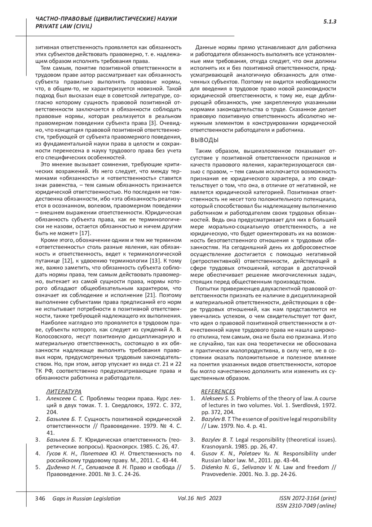 2. Базылев Б. Т. Сущность позитивной юридической ответственности // Правоведение. 1979. № 4. С. 41. EDN: UCCOER