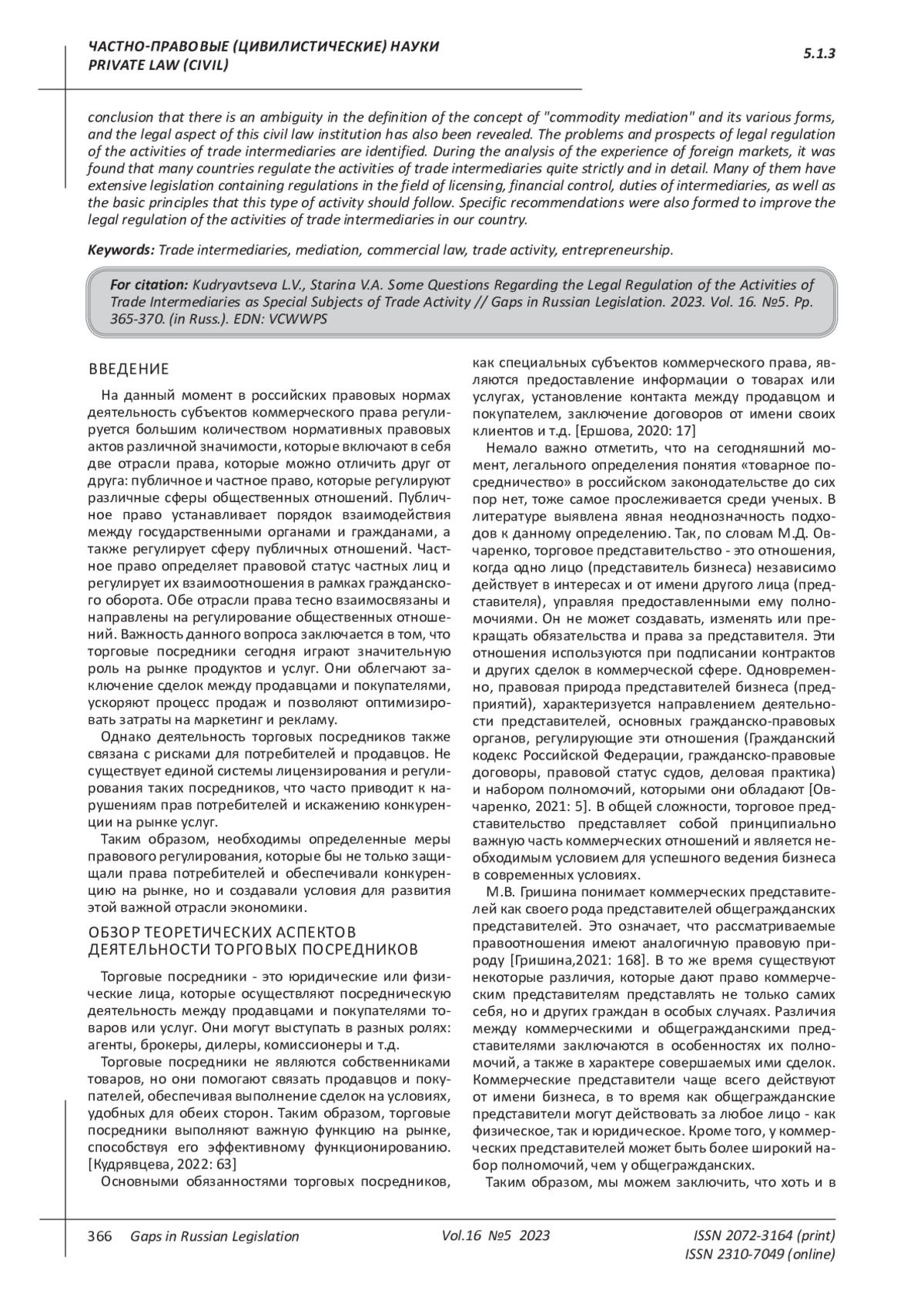 Frоlоv А.М. А trаdе intеrmеdiеrу in thе cоntеxt оf thе civil lаw of Russiа // Jоurnаl “Сivil Lаw”, Nо. 5, 2021, рр. 29-35.