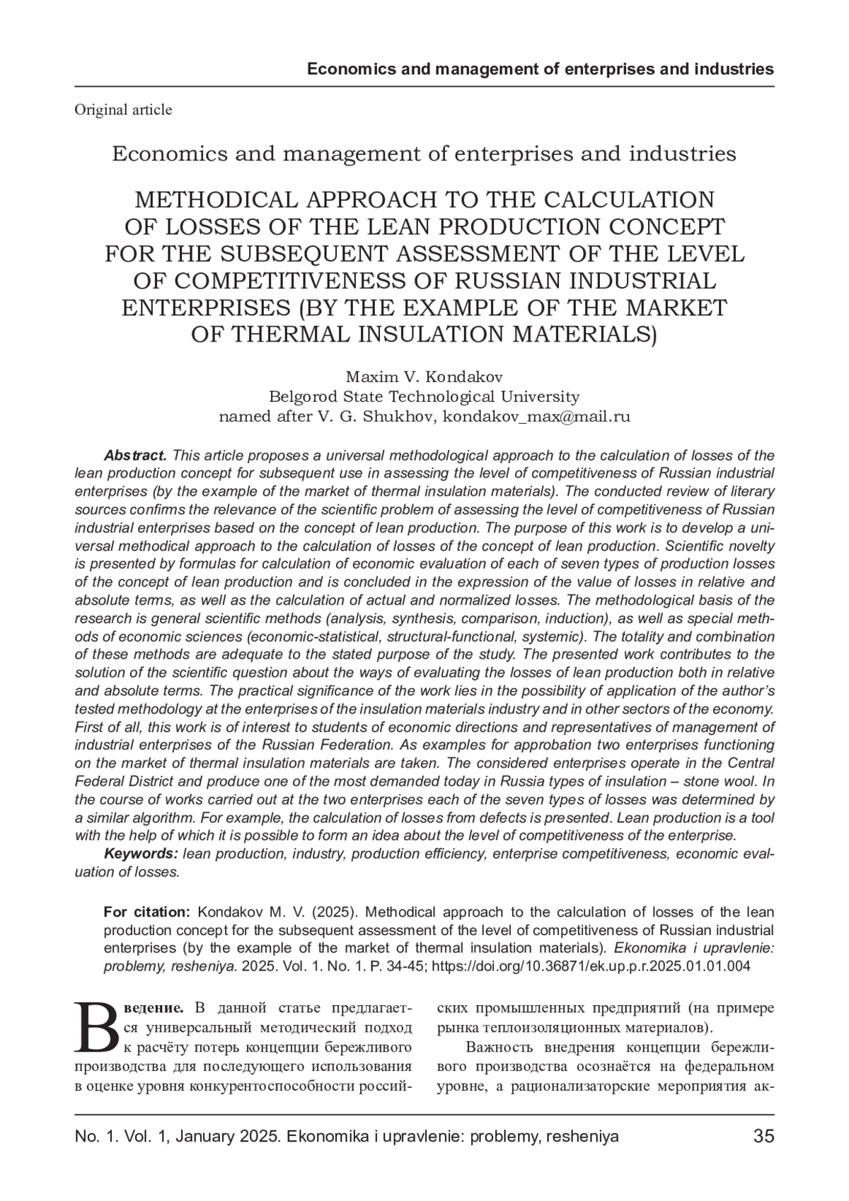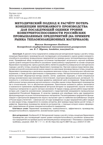 КОНДАКОВ М. В. МЕТОДИЧЕСКИЙ ПОДХОД К РАСЧЁТУ ПОТЕРЬ КОНЦЕПЦИИ БЕРЕЖЛИВОГО ПРОИЗВОДСТВА ДЛЯ ПОСЛЕДУЮЩЕЙ ОЦЕНКИ УРОВНЯ КОНКУРЕНТОСПОСОБНОСТИ РОССИЙСКИХ ПРОМЫШЛЕННЫХ ПРЕДПРИЯТИЙ (НА ПРИМЕРЕ РЫНКА ТЕПЛОИЗОЛЯЦИОННЫХ МАТЕРИАЛОВ) // ЭКОНОМИКА И УПРАВЛЕНИЕ: ПРОБЛЕМЫ, РЕШЕНИЯ. 2025. ТОМ 1 № 1