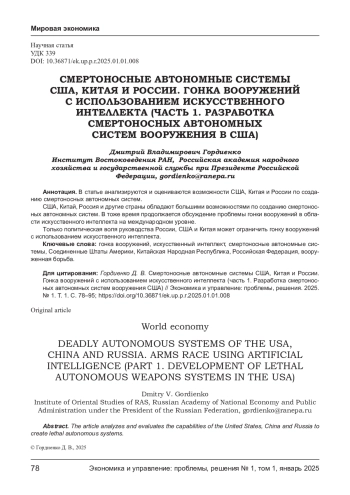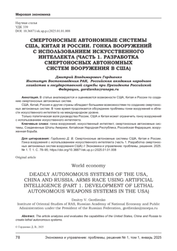 В статье анализируются и оцениваются возможности США, Китая и России по созданию смертоносных автономных систем. США, Китай, Россия и другие страны обладают большими возможностями по созданию смертоносных автономных систем. В тоже время продолжается обсуждение проблемы гонки вооружений в области искусственного интеллекта на международном уровне. Только политическая воля руководства России, США и Китая может ограничить гонку вооружений с использованием искусственного интеллекта.