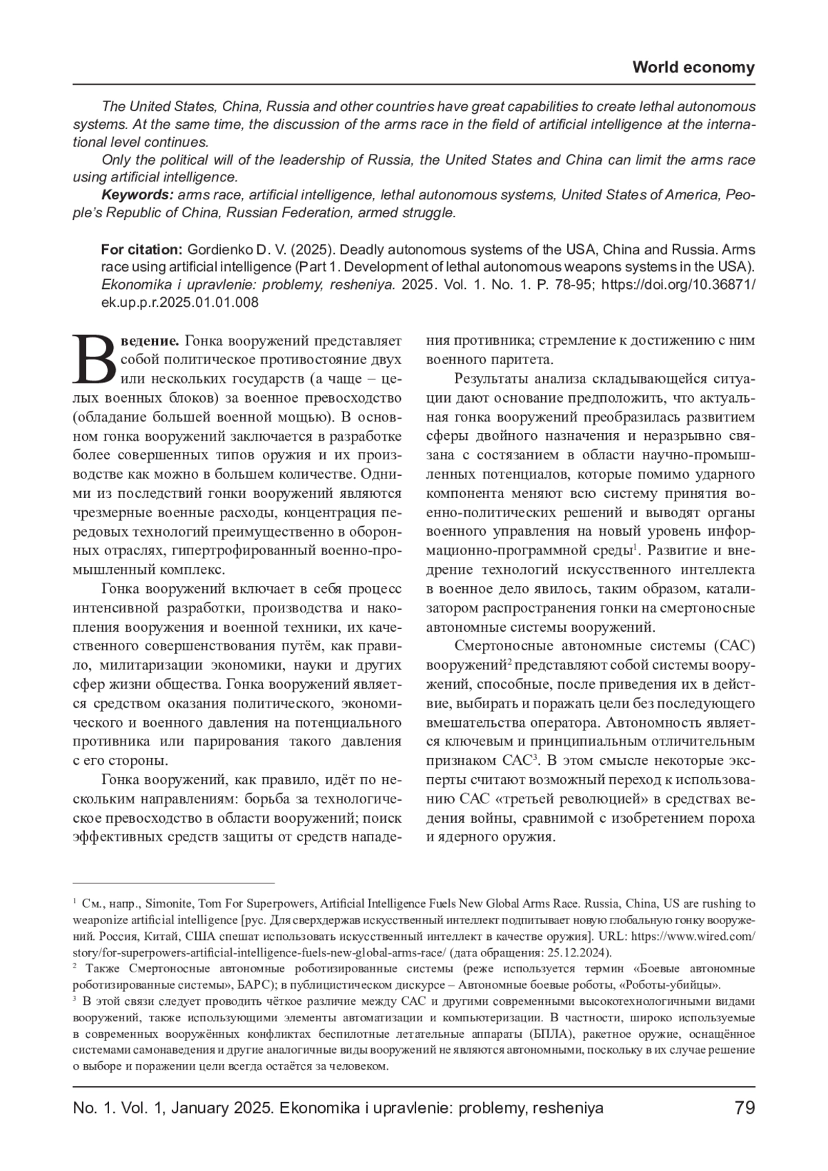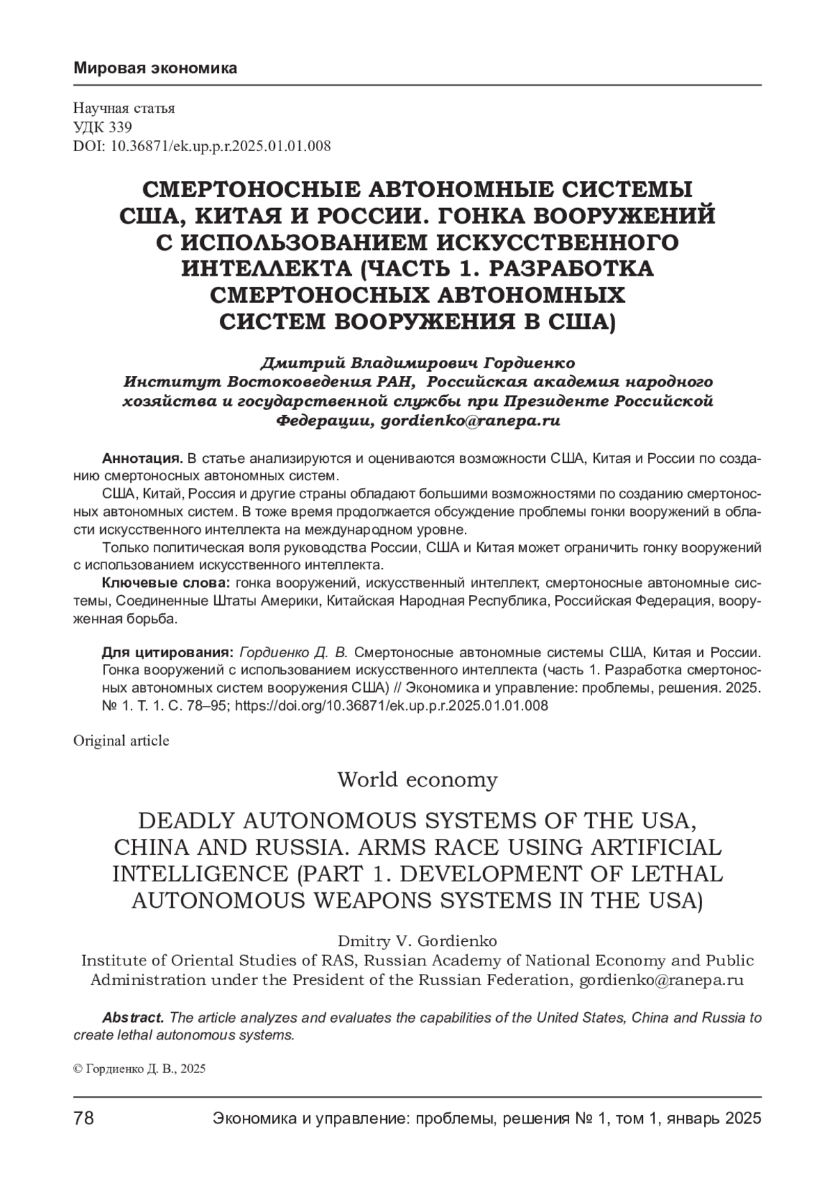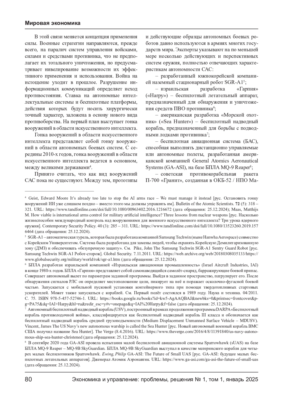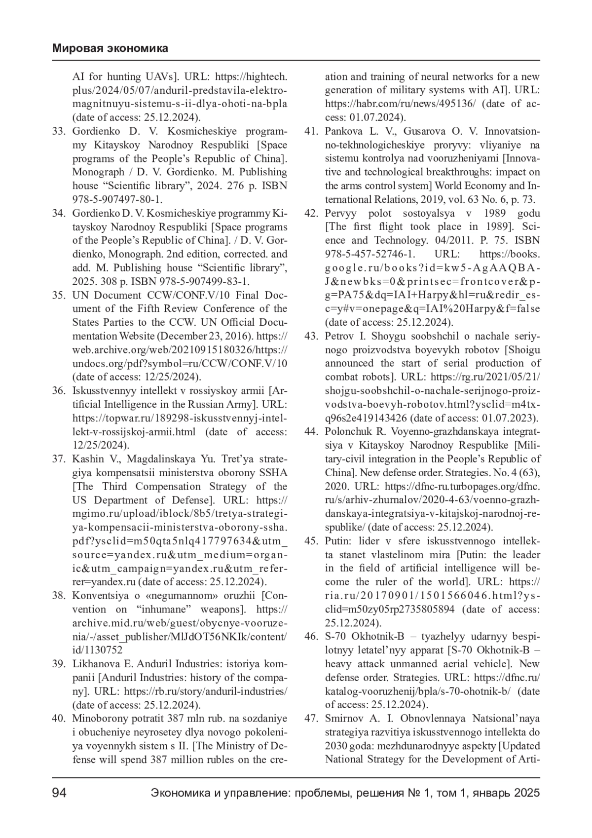 41. Панкова Л. В., Гусарова О. В. Иновационно-технологические прорывы: влияние на систему контроля над вооружениями // Мировая экономика и международные отношения, 2019, том 63 №6, с. 73. EDN: CULGBO