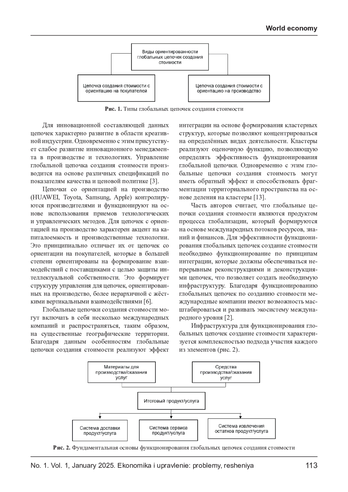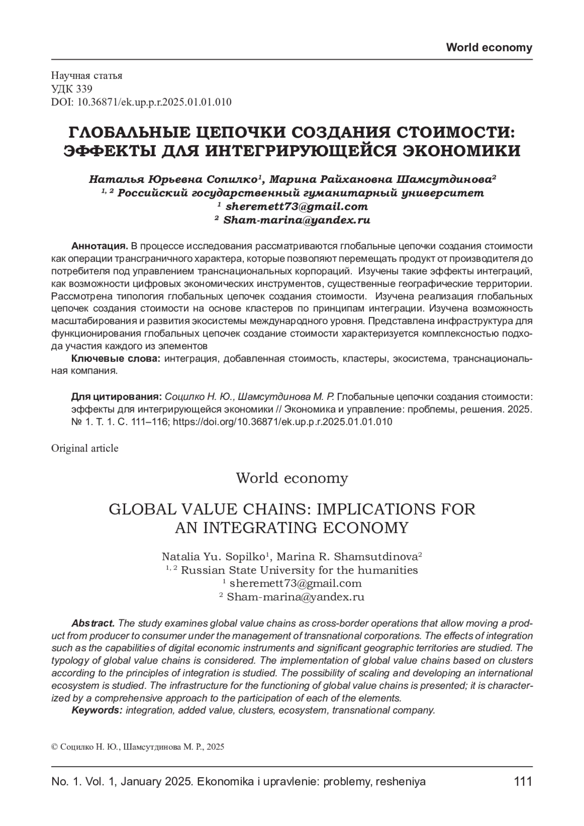 В процессе исследования рассматриваются глобальные цепочки создания стоимости как операции трансграничного характера, которые позволяют перемещать продукт от производителя до потребителя под управлением транснациональных корпораций. Изучены такие эффекты интеграций, как возможности цифровых экономических инструментов, существенные географические территории. Рассмотрена типология глобальных цепочек создания стоимости. Изучена реализация глобальных цепочек создания стоимости на основе кластеров по принципам интеграции. Изучена возможность масштабирования и развития экосистемы международного уровня. Представлена инфраструктура для функционирования глобальных цепочек создание стоимости характеризуется комплексностью подхода участия каждого из элементов.