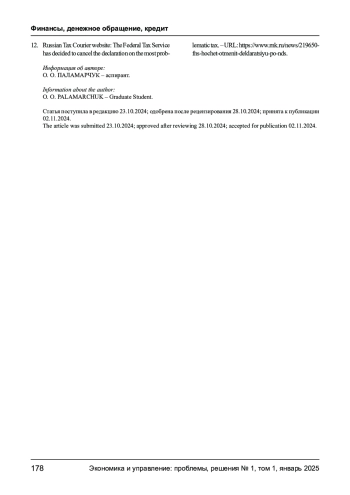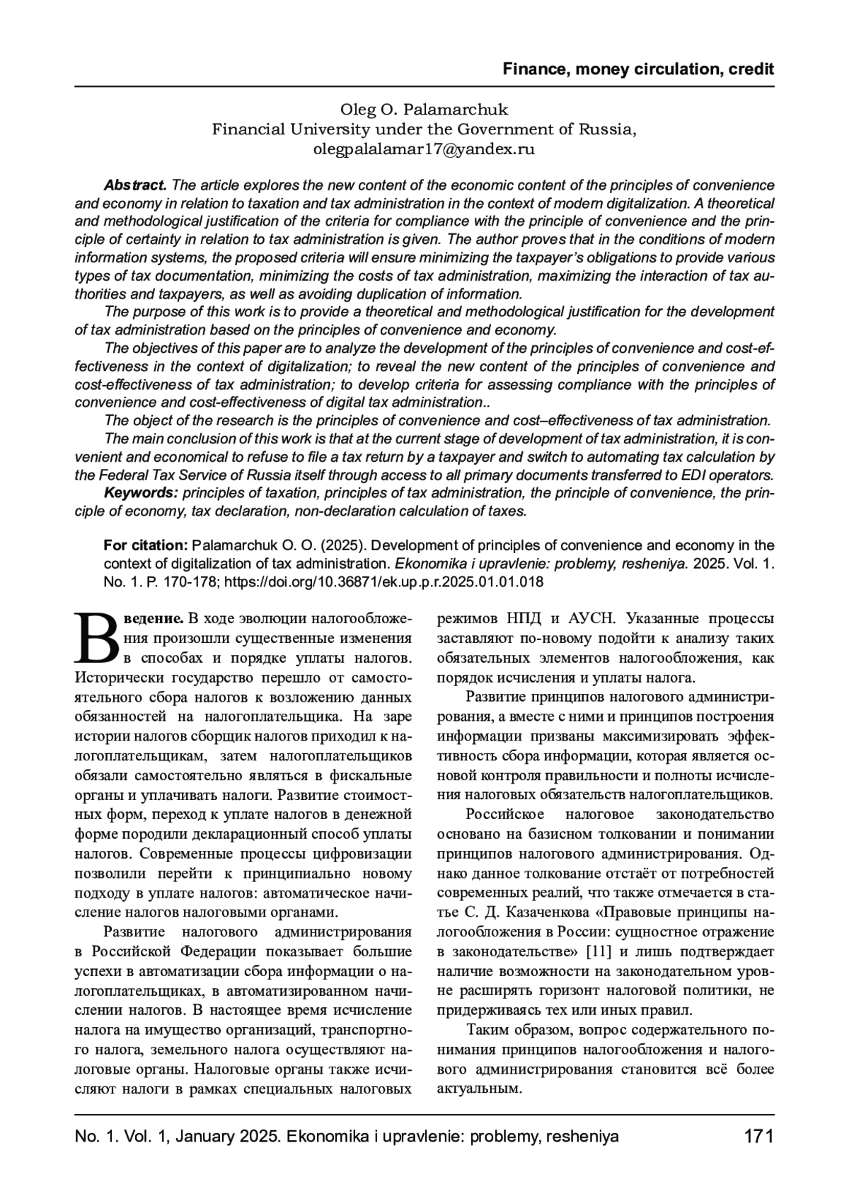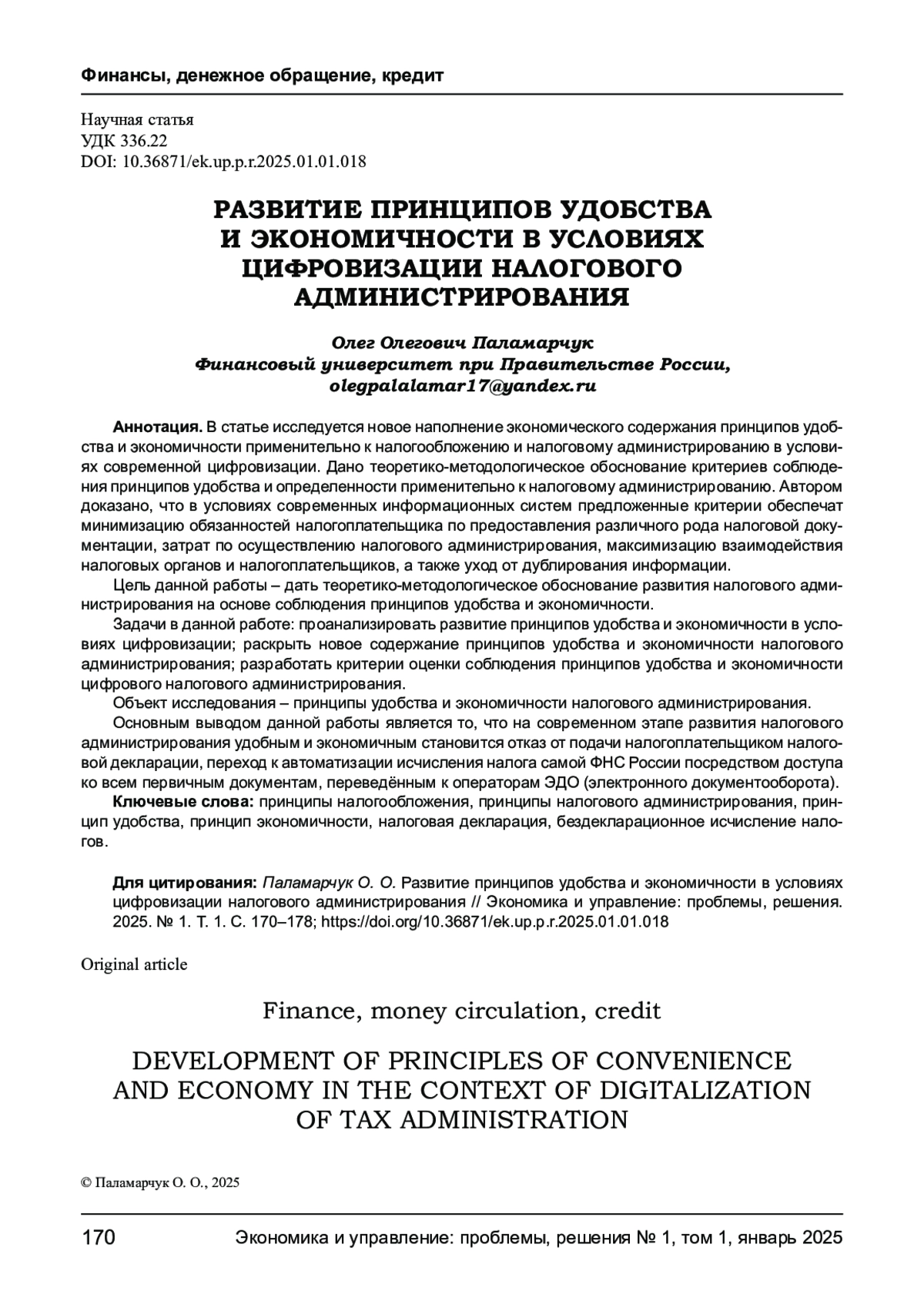 ПАЛАМАРЧУК О. О. РАЗВИТИЕ ПРИНЦИПОВ УДОБСТВА И ЭКОНОМИЧНОСТИ В УСЛОВИЯХ ЦИФРОВИЗАЦИИ НАЛОГОВОГО АДМИНИСТРИРОВАНИЯ // ЭКОНОМИКА И УПРАВЛЕНИЕ: ПРОБЛЕМЫ, РЕШЕНИЯ. 2025. ТОМ 1 № 1