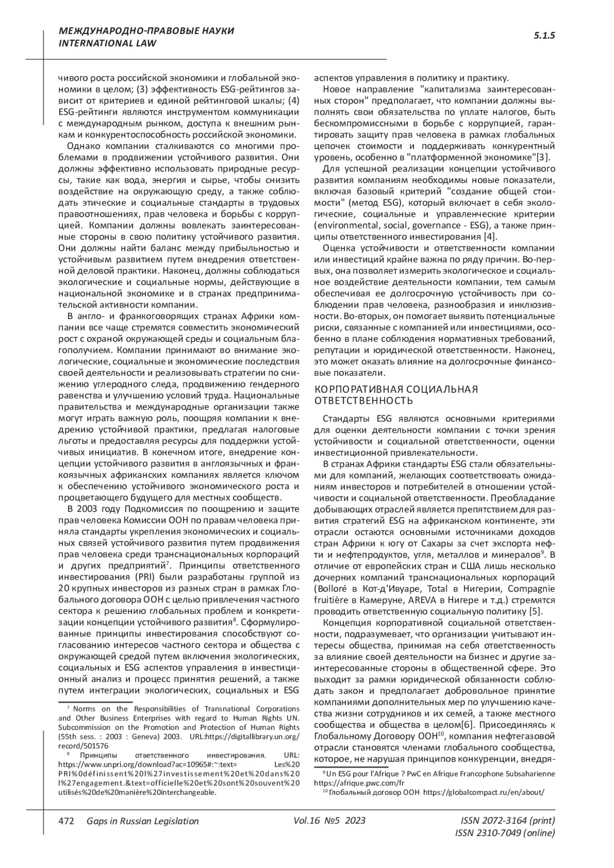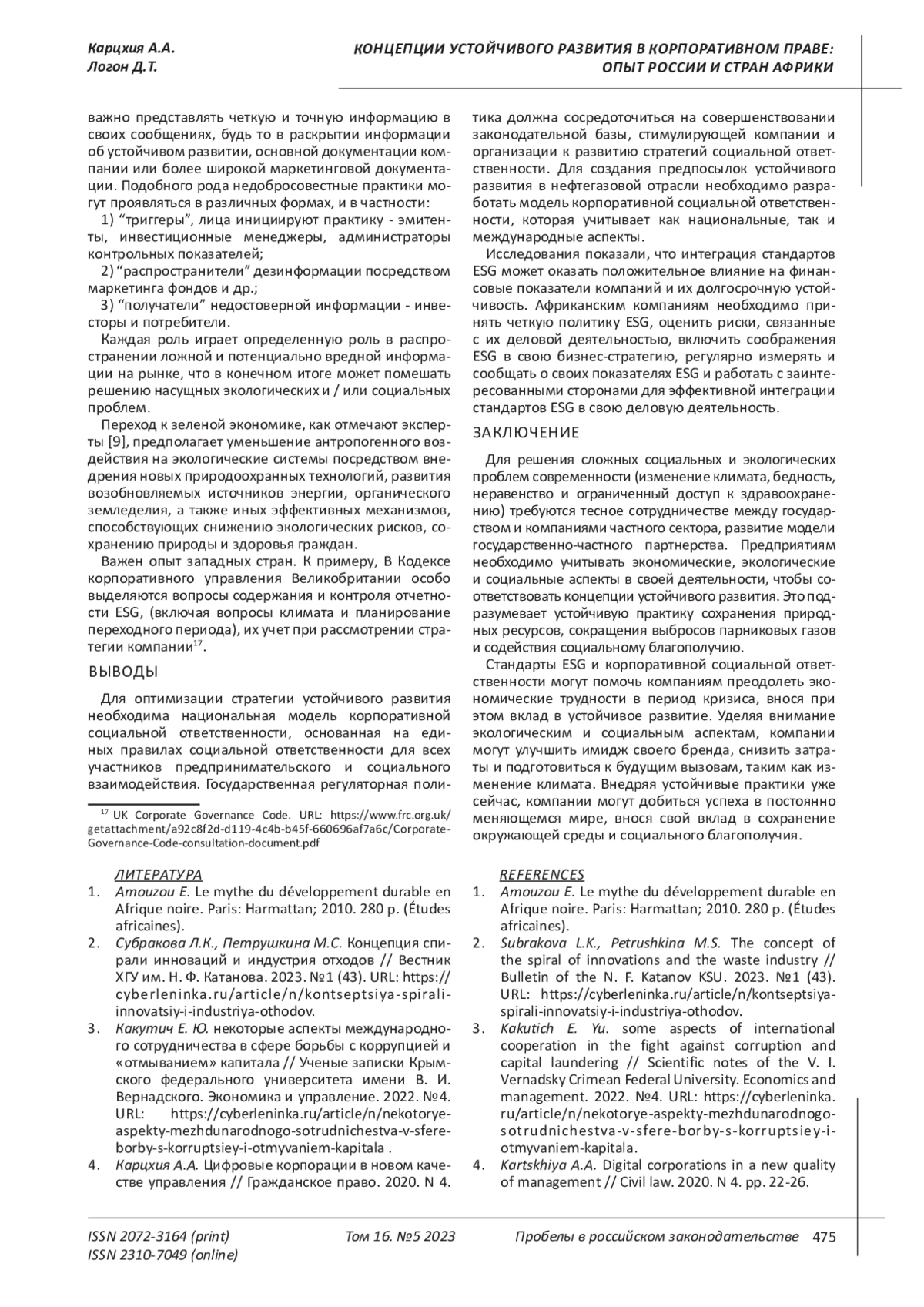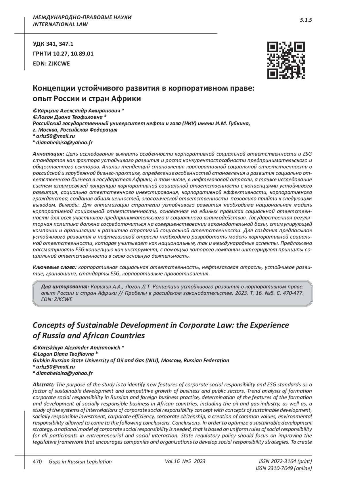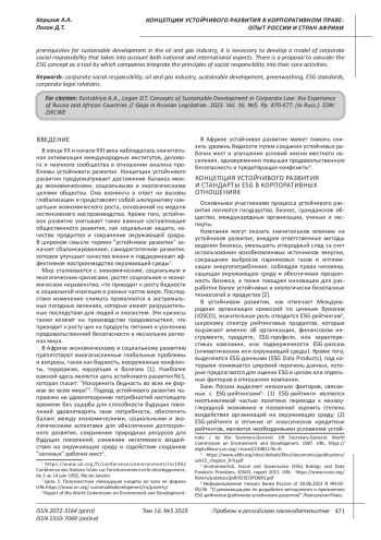 ЛОГОН Д. Т., КАРЦХИЯ А. А. КОНЦЕПЦИИ УСТОЙЧИВОГО РАЗВИТИЯ В КОРПОРАТИВНОМ ПРАВЕ: ОПЫТ РОССИИ И СТРАН АФРИКИ // ПРОБЕЛЫ В РОССИЙСКОМ ЗАКОНОДАТЕЛЬСТВЕ. 2023. Т. 16 № 5