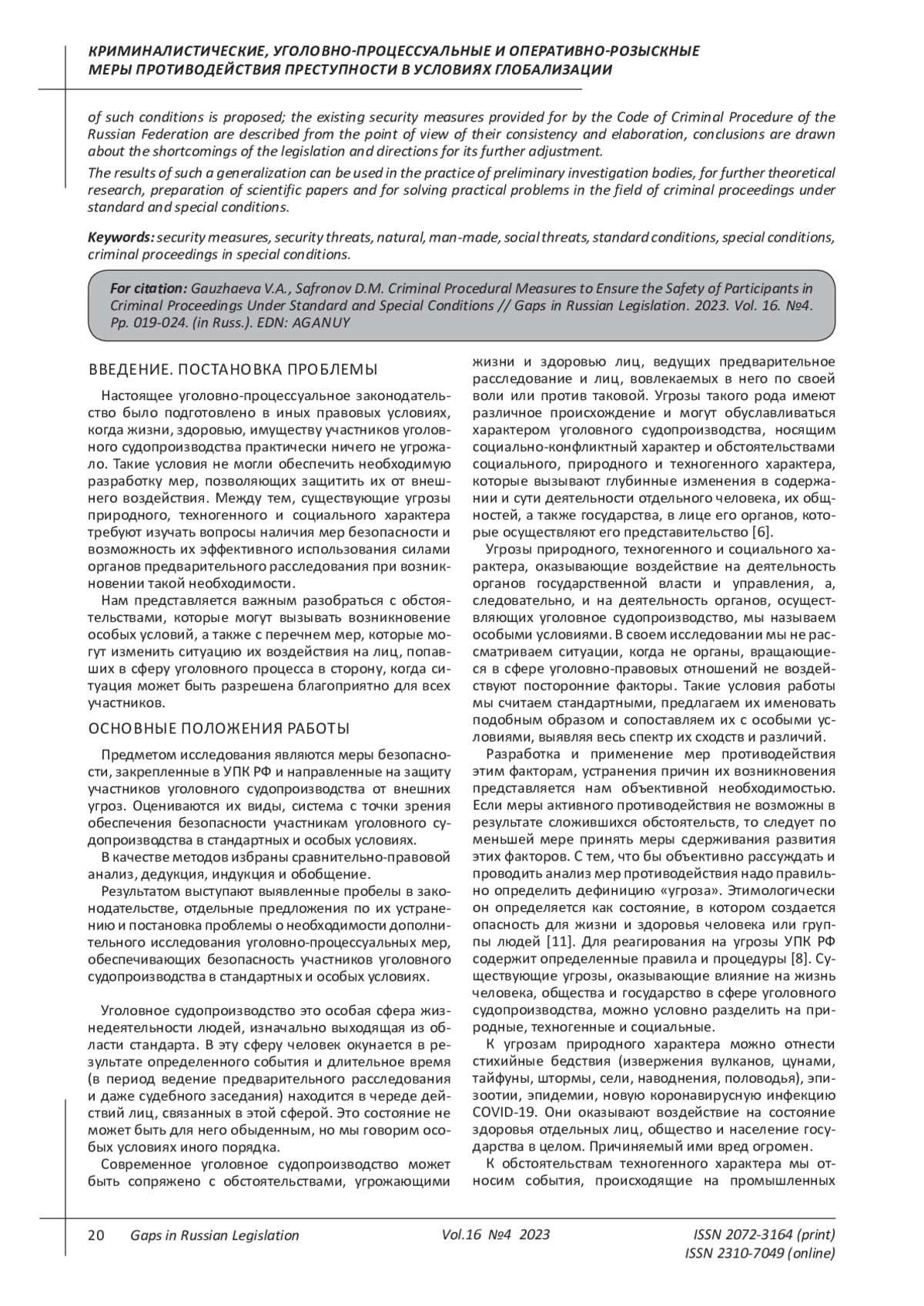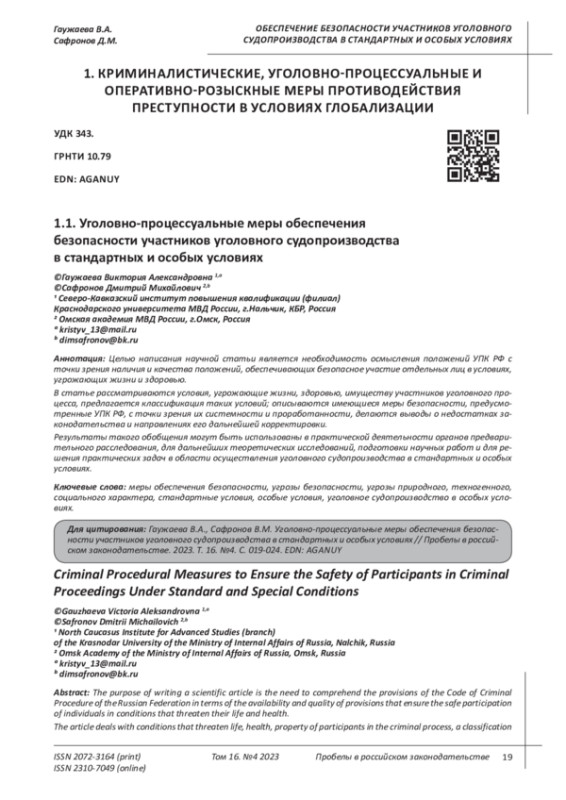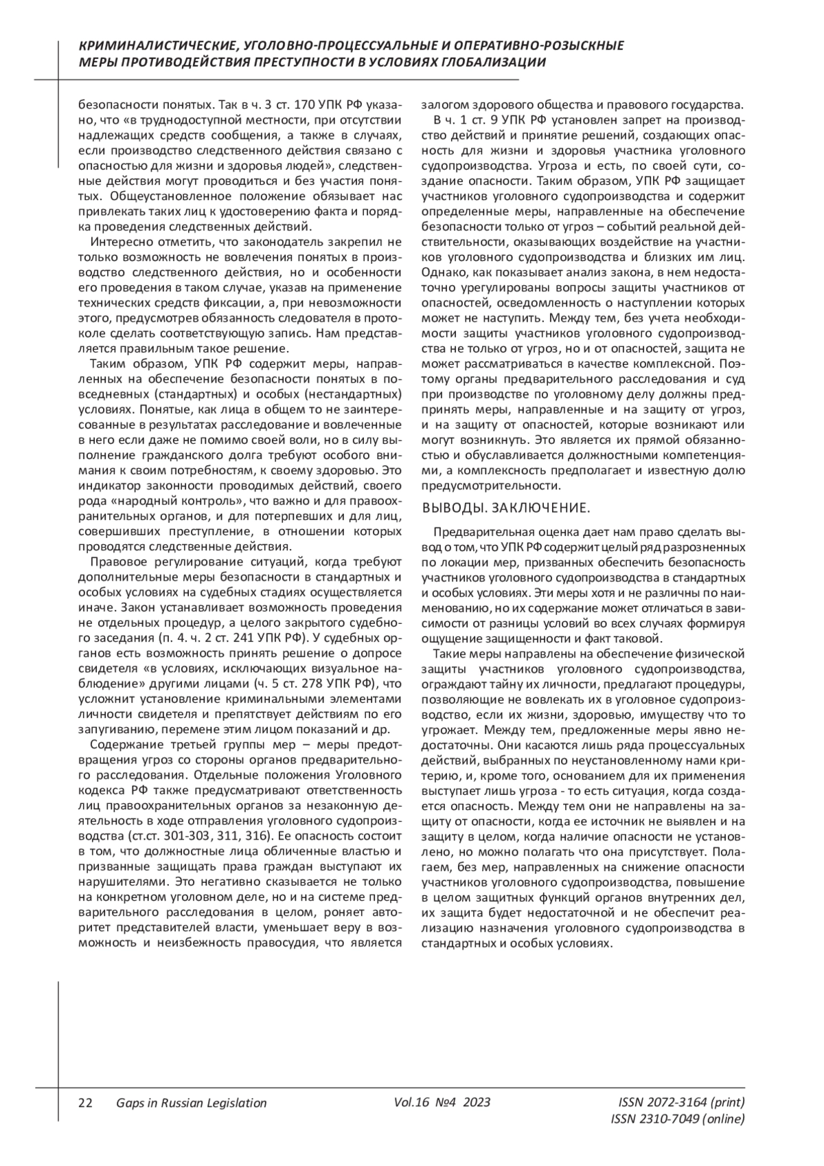Целью написания научной статьи является необходимость осмысления положений УПК РФ с точки зрения наличия и качества положений, обеспечивающих безопасное участие отдельных лиц в условиях, угрожающих жизни и здоровью. В статье рассматриваются условия, угрожающие жизни, здоровью, имуществу участников уголовного процесса, предлагается классификация таких условий; описываются имеющиеся меры безопасности, предусмотренные УПК РФ, с точки зрения их системности и проработанности, делаются выводы о недостатках законодательства и направлениях его дальнейшей корректировки. Результаты такого обобщения могут быть использованы в практической деятельности органов предварительного расследования, для дальнейших теоретических исследований, подготовки научных работ и для решения практических задач в области осуществления уголовного судопроизводства в стандартных и особых условиях.