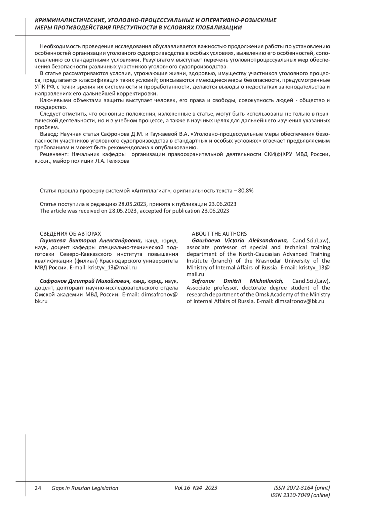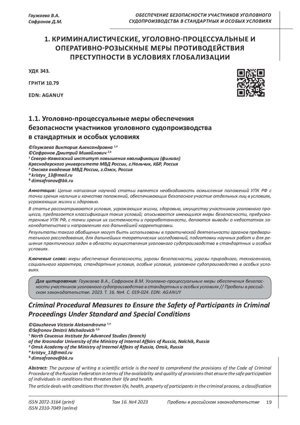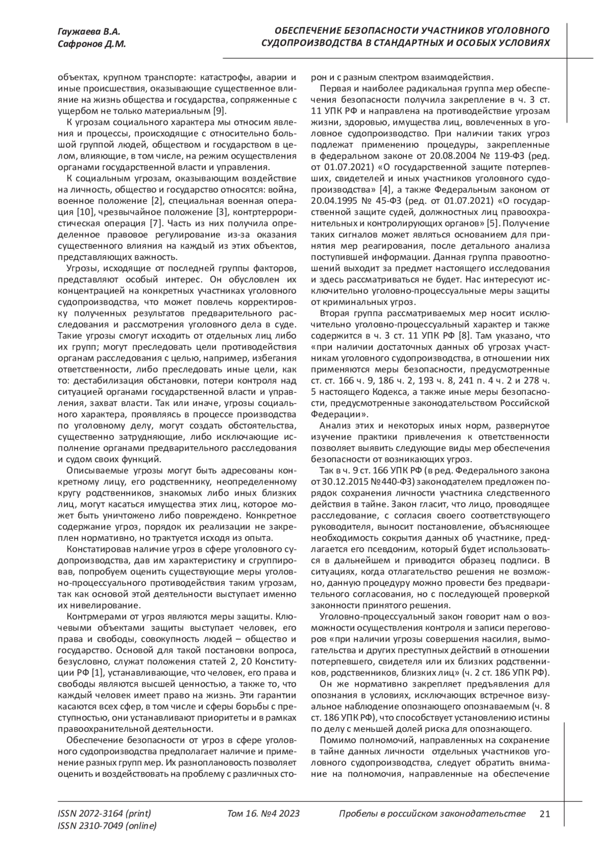 Целью написания научной статьи является необходимость осмысления положений УПК РФ с точки зрения наличия и качества положений, обеспечивающих безопасное участие отдельных лиц в условиях, угрожающих жизни и здоровью. В статье рассматриваются условия, угрожающие жизни, здоровью, имуществу участников уголовного процесса, предлагается классификация таких условий; описываются имеющиеся меры безопасности, предусмотренные УПК РФ, с точки зрения их системности и проработанности, делаются выводы о недостатках законодательства и направлениях его дальнейшей корректировки. Результаты такого обобщения могут быть использованы в практической деятельности органов предварительного расследования, для дальнейших теоретических исследований, подготовки научных работ и для решения практических задач в области осуществления уголовного судопроизводства в стандартных и особых условиях.