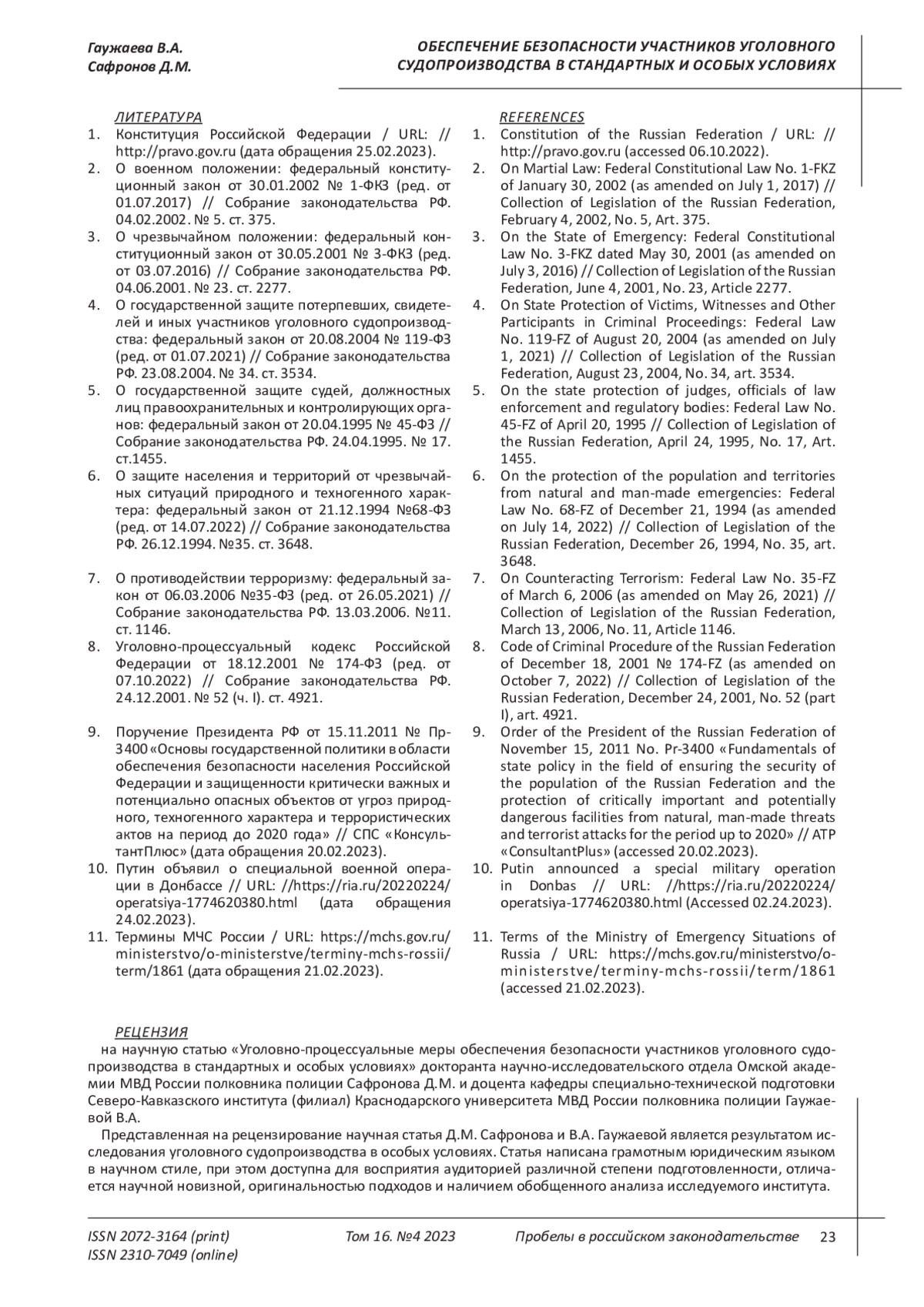 8. Уголовно-процессуальный кодекс Российской Федерации от 18.12.2001 № 174-ФЗ (ред. от 07.10.2022) // Собрание законодательства РФ. 24.12.2001. № 52 (ч. I). ст. 4921.
