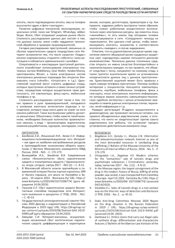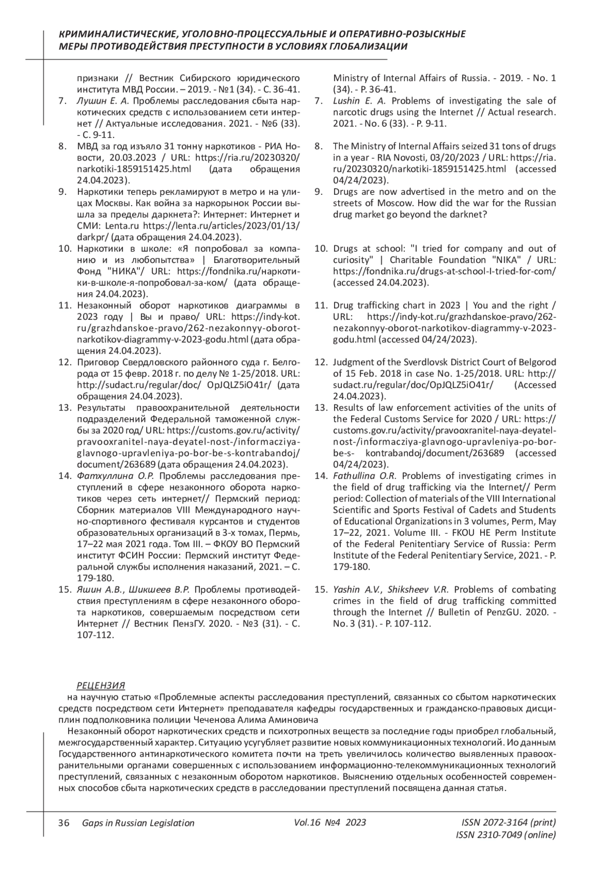 ЧЕЧЕНОВ А. А. ПРОБЛЕМНЫЕ АСПЕКТЫ РАССЛЕДОВАНИЯ ПРЕСТУПЛЕНИЙ, СВЯЗАННЫХ СО СБЫТОМ НАРКОТИЧЕСКИХ СРЕДСТВ ПОСРЕДСТВОМ СЕТИ ИНТЕРНЕТ // ПРОБЕЛЫ В РОССИЙСКОМ ЗАКОНОДАТЕЛЬСТВЕ. 2023. Т. 16 № 4