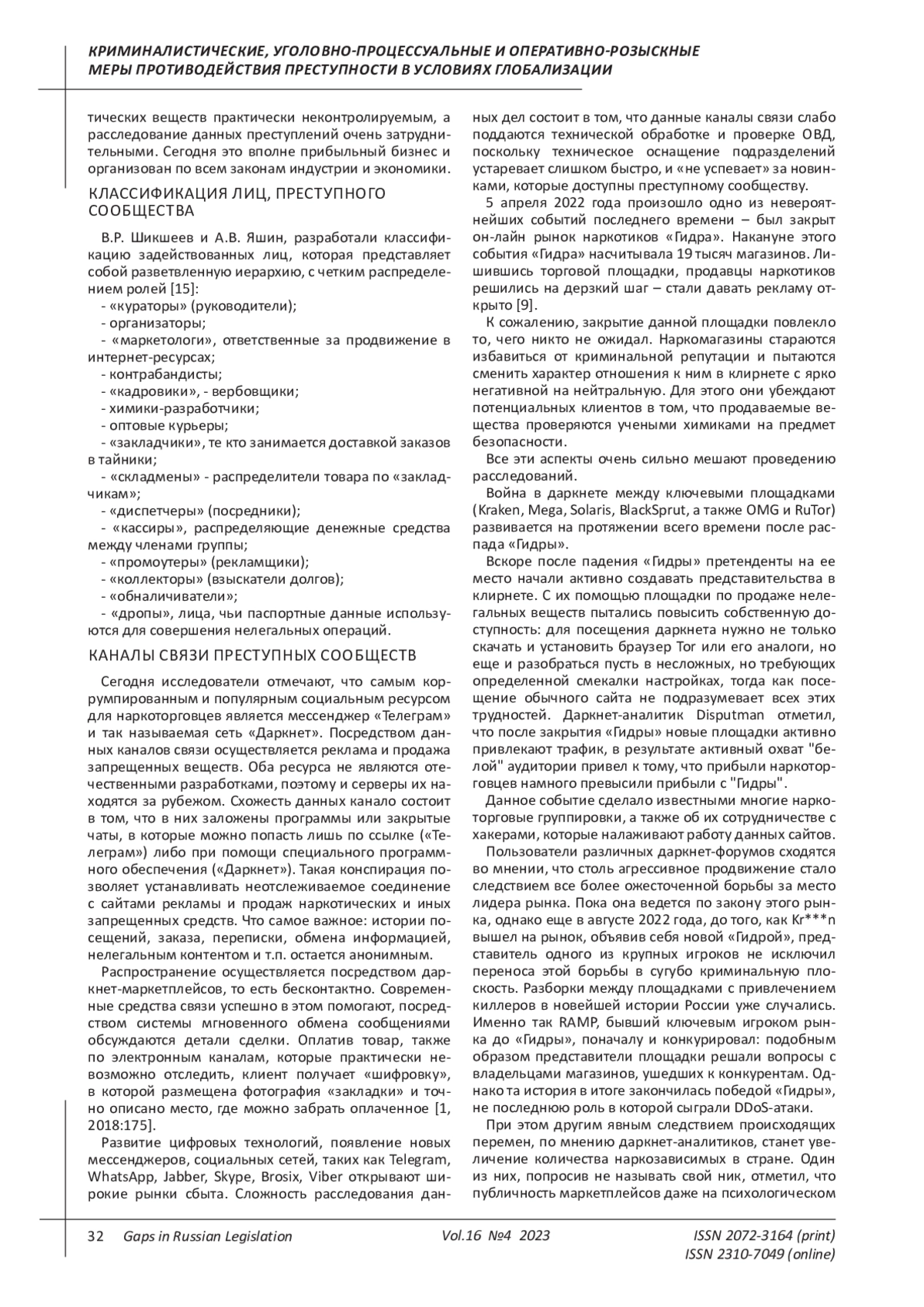 Статья: ПРОБЛЕМНЫЕ АСПЕКТЫ РАССЛЕДОВАНИЯ ПРЕСТУПЛЕНИЙ, СВЯЗАННЫХ СО СБЫТОМ НАРКОТИЧЕСКИХ СРЕДСТВ ПОСРЕДСТВОМ СЕТИ ИНТЕРНЕТ (2023)