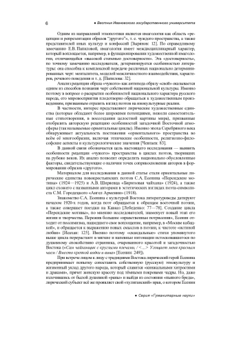 Настоящее исследование имеет своей целью проследить особенности воплощения «чужого пространства» в ориентальных циклах поэтов-новокрестьян С. А. Есенина и А. В. Ширяевца, а также в художественном единстве С. М. Городецкого. В работе предпринимается попытка отобразить национальные детерминанты в изображении неродных просторов в лирических единствах «Персидские мотивы», «Бирюзовая чайхана», «Ангел Армении», созданных названными авторами. В работе обращается особое внимание на стремление лирических героев исследуемых произведений погрузиться в атмосферу другого государства, понять и принять его традиции, особенности культуры и палитру нравов, принятых в ином, с точки зрения национального самосознания, обществе. В результате работы устанавливается, что особенности образного строя рассматриваемых произведений С. А. Есенина, А. В. Ширяевца, С. М. Городецкого свидетельствуют об общности восприятия ими «чужого пространства», основанного на толерантности по отношению к инокультурным реалиям, что оказывается одной из черт национального самосознания русского человека. Итоги исследования фиксируют наличие творческого диалога в художественном наследии поэтов Серебряного века