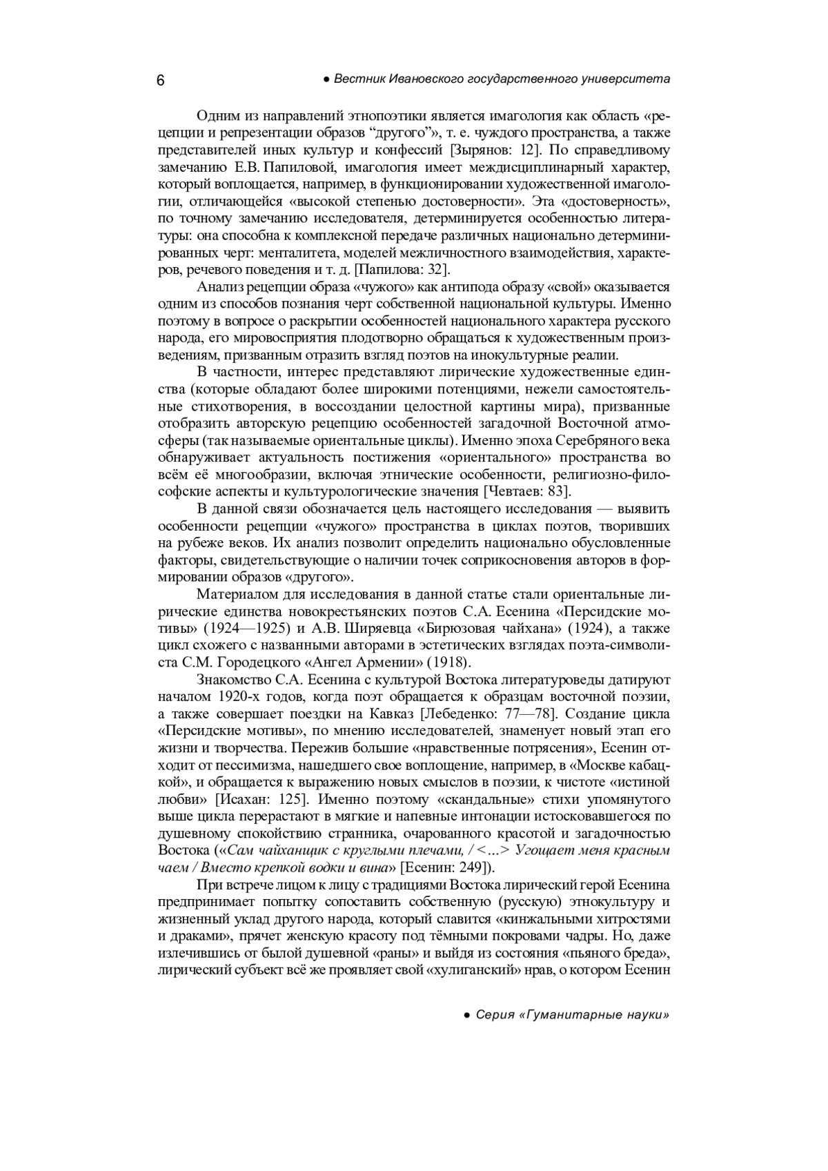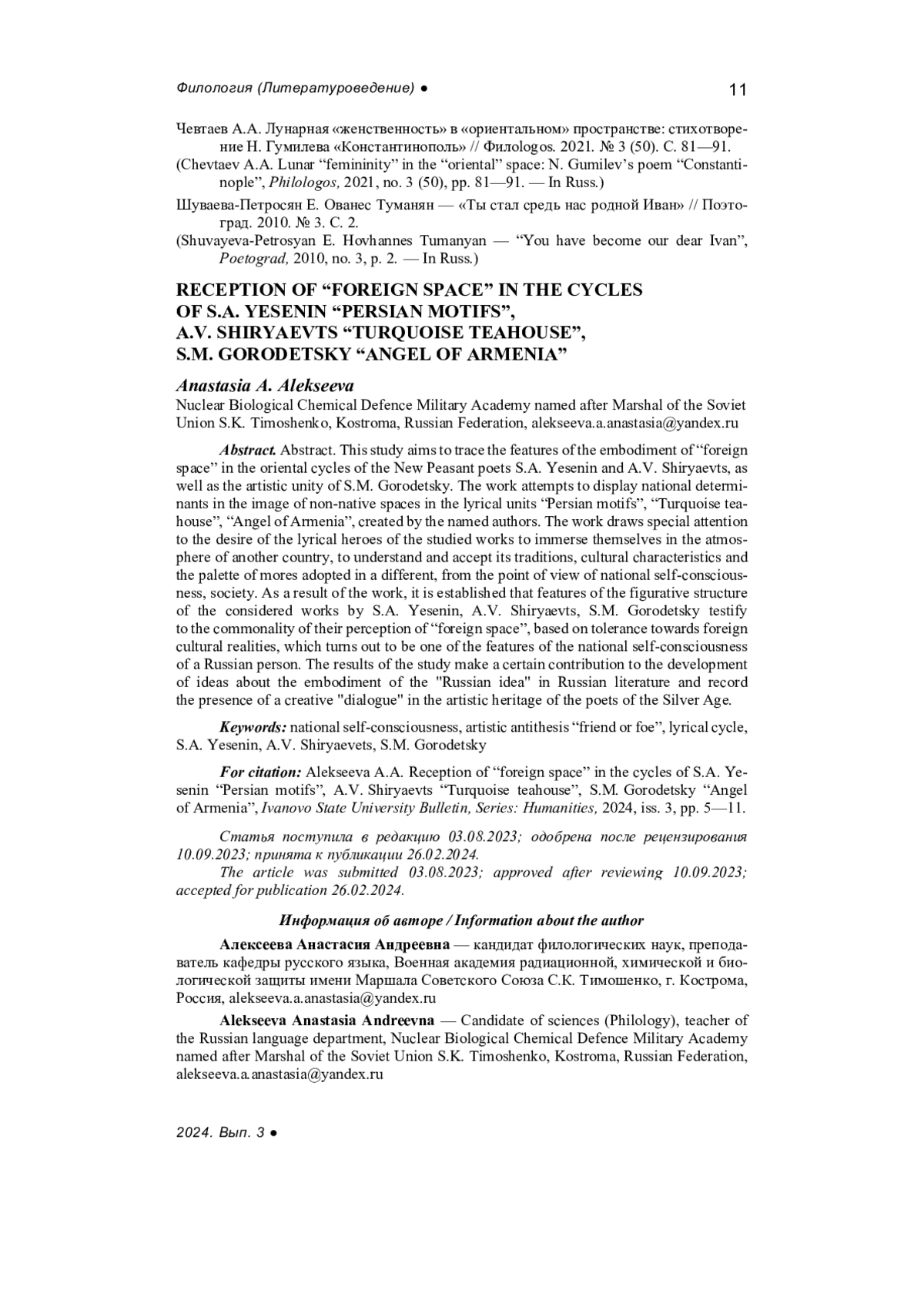АЛЕКСЕЕВА А. А. РЕЦЕПЦИЯ "ЧУЖОГО ПРОСТРАНСТВА" В ЦИКЛАХ С. А. ЕСЕНИНА "ПЕРСИДСКИЕ МОТИВЫ", А. В. ШИРЯЕВЦА "БИРЮЗОВАЯ ЧАЙХАНА", С. М. ГОРОДЕЦКОГО "АНГЕЛ АРМЕНИИ" // ВЕСТНИК ИВАНОВСКОГО ГОСУДАРСТВЕННОГО УНИВЕРСИТЕТА. СЕРИЯ: ГУМАНИТАРНЫЕ НАУКИ. 2024. № 3