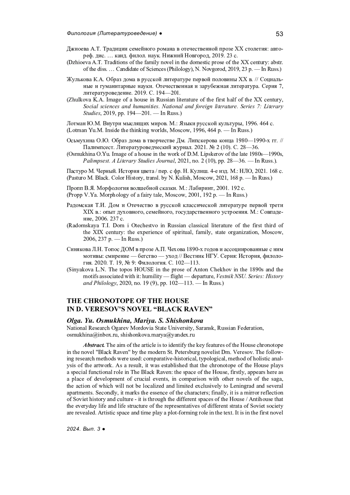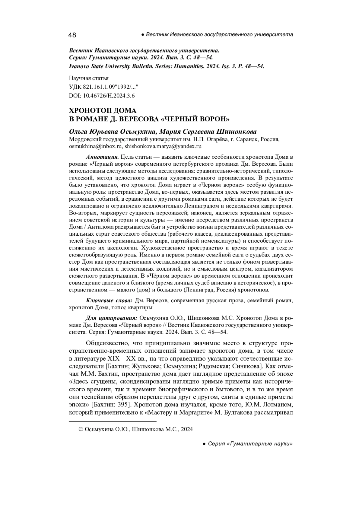 ОСЬМУХИНА О. Ю., ШИШОНКОВА М. С. ХРОНОТОП ДОМА В РОМАНЕ Д. ВЕРЕСОВА "ЧЕРНЫЙ ВОРОН" // ВЕСТНИК ИВАНОВСКОГО ГОСУДАРСТВЕННОГО УНИВЕРСИТЕТА. СЕРИЯ: ГУМАНИТАРНЫЕ НАУКИ. 2024. № 3